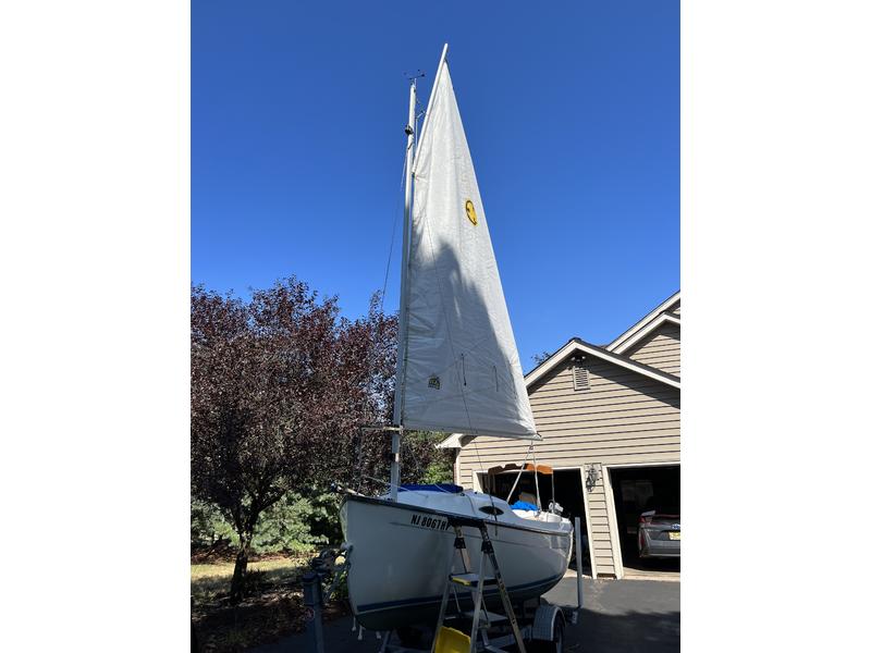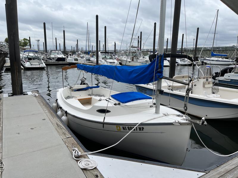 17' Sunday Cat (Com-Pac Yachts) with seating for five in 9' cockpit and small cabin for port-potty and storage. Easy raising mast with Mastendr Quick Rig Sailing system. 14" draft with board up