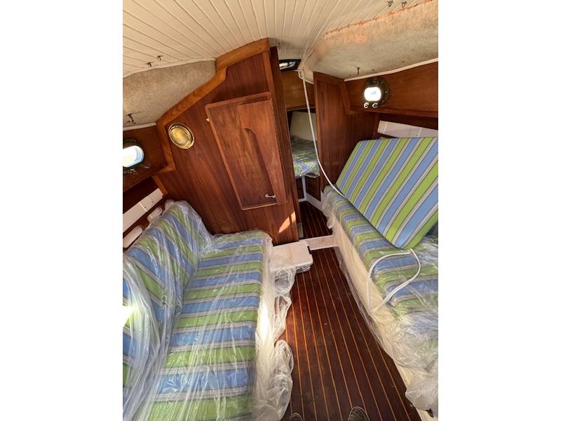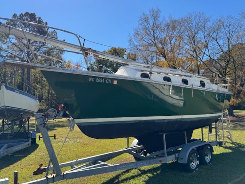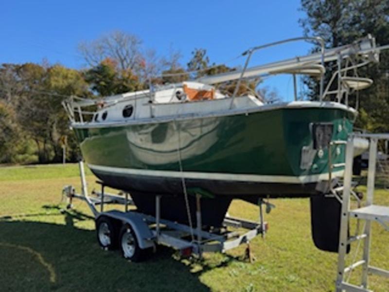 The boat has new cushions, and a full set of sails and roller furling. The trailer has 4 new wheels and new actuator/Hitch but the brakes do not work. The brake line/Drums probably need replacing. The boat was damaged during Hurricane Florence in 2018. It was on the hard and fell onto a boat stand which damaged the starboard side. The repair was made by Keith Scott at the Sailboat Company. The boat was reported totaled by the previous owner's insurance company, therefore if the buyer plans to insure it, you will need to check with your insurance company first. You can see where it was fixed in the first picture.