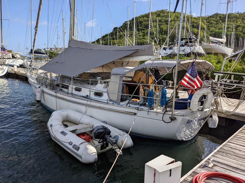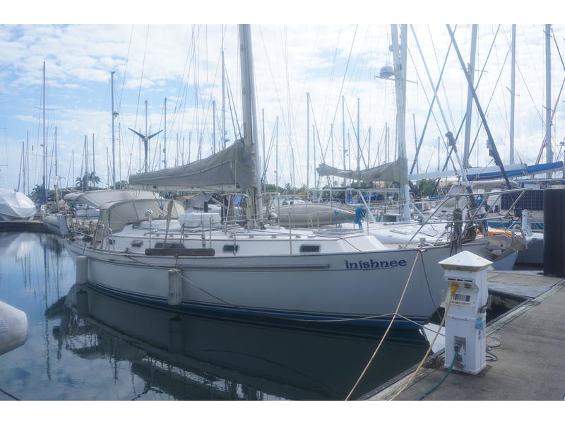 Inishnee is a beautifully maintained boat proven world cruiser in excellent condition with many upgrades. Her two comfortable cabins, include a vee berth owners cabin. Her teak and holly flooring with teak cabinetry are beautifully paired to create a warm comfortable feeling in her spacious salon. A well equipped galley aft of the U shaped dining area and settee allow for an open feeling. Thanks to its displacement relative to size, the deep forefoot (in front) that then transitions into a cruising fin keel, skeg-hung rudder, and solid construction, this yacht has a comfortable motion in waves. Its not a racing machine, but for many cruising sailors thats exactly the point.