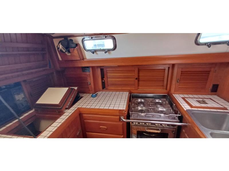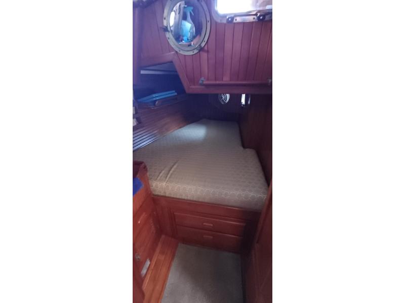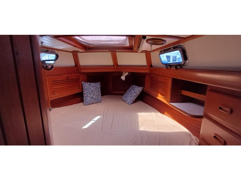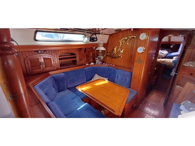Accomodation The spacious main salon features a comfortable U-shaped settee to starboard, upholstered in blue fabric in excellent condition. The adjustable dining table allows for easy conversion between dining and lounging, and there is ample storage beneath and behind the seating. To port, the well-appointed galley is thoughtfully laid out for use underway or at anchor. Forward, the private V-berth cabin includes generous storage and a solid teak privacy door. A full head with a separate shower stall provides the comfort of home on longer passages. Aft to starboard, the private aft cabin offers a cozy retreat with its own teak door for complete privacy.