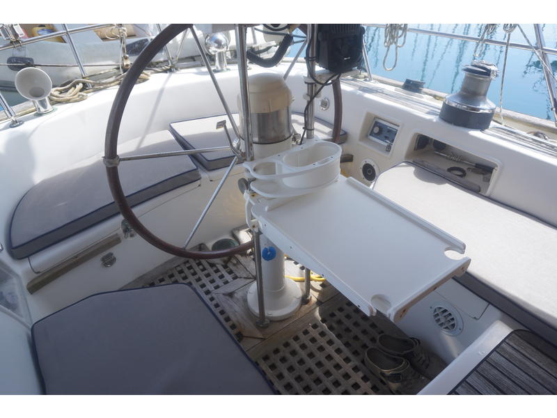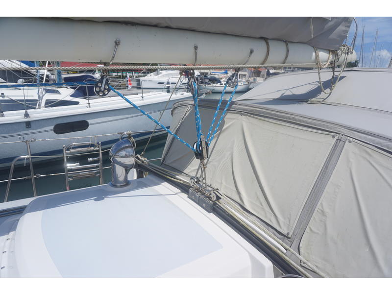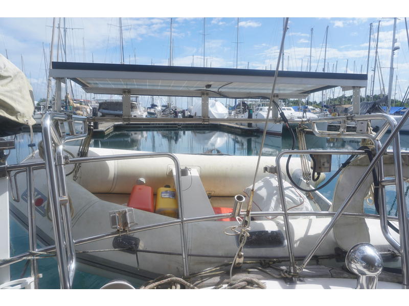 Rig and Sails New rigging in Grenada 2020 (9500 usd) Chain plates removed and replaced 2014 Removeable inner forstay Rigid vang Mid boom traveller sheeting forward of cockpit Solid rails in pushpit Barient winches x 4 in cockpit, 1 on mast Stainless rails and Davits for dinghy lift and solar panel Self tailing winch on mast for reefing Fairlead cars on tracks with pulleys to operate from cockpit. Schaefer line blocks in cockpit for running rigging. 3-reef mainsail in good condition 2014 Cruising jib in good condition 2014 Asymmetrical spinnaker for downwind sailing 2014 Storm staysail for heavy weather 2013 Barient winches for easy sail handling. Lazy bag 2020 with side shade panels Water system Pressurized hot and cold water Hot water tank Manual foot pump at galley salt Watermaker 12 v Spectra with Katedyn pump, not high output but reliable All water hoses replace in 2014