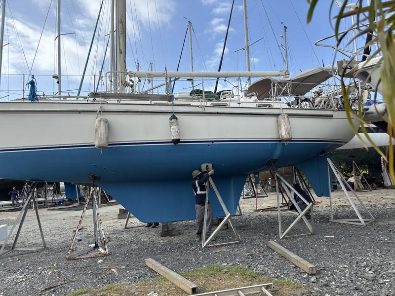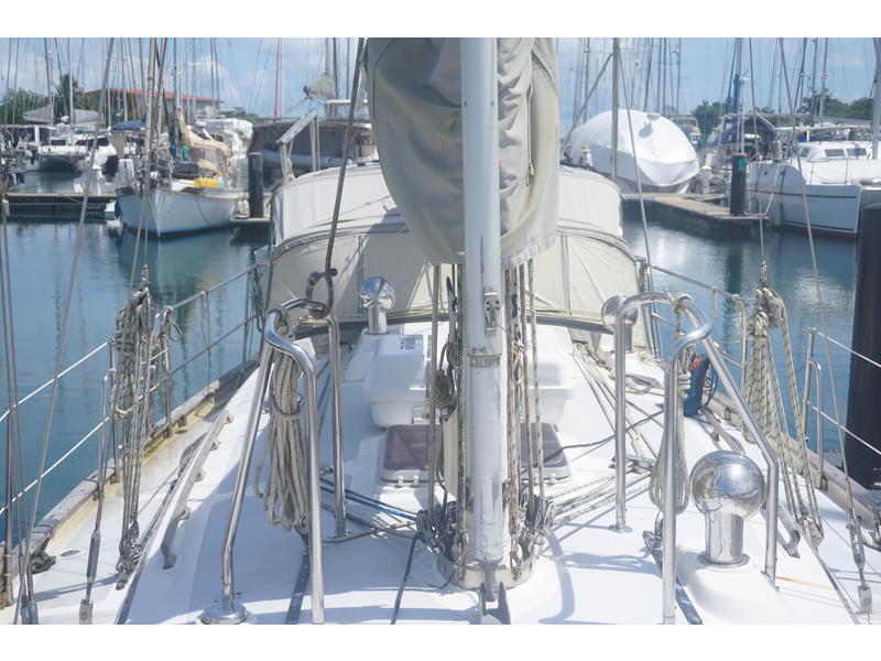 Hull White superstructure and decks GRP Skeg hung rudder with long fin cruising keel Wheel steering Aft Cockpit with excellent bimini Antifouling and anodes replaced December 2024 in Panama Stainless opening ports all with rain shields. Thru hulls replaced 2014 Bottom peeled and epoxy barrier coat 2012, with new bottom paint in Dec 2024 Teak decks removed 2015-2016 Hull completely repainted from decks and topsides to keel in 2015-2016