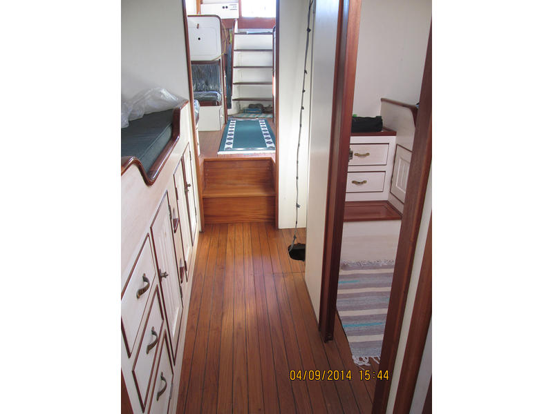 Her teak decks are to 1″ thick, and cabin soles are 1″ thick throughout the interior and cabin sides are 2″ solid teak.
