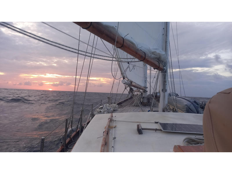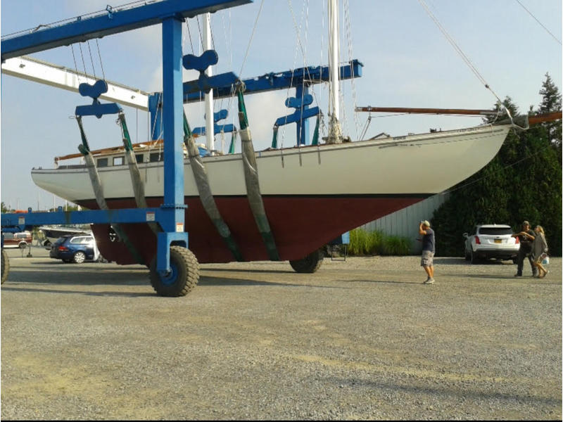 Engine is Perkins 4.236 installed when boat was built. I would guess there's less than 8,000 hours on it. New oil cooler and hoses Nov. 2024, new Vetus exhaust system Nov 2024. Borg Warner transmission 2.10 : 1 reduction, left hand 3 bladed propeller 20 in.dia 16" pitch. Transmission taken out in 2023, checked, cleaned up and painted. There are 2 copper (approx. 40 gallon) water tanks, one under each forward berth, and space for more tankage under the mid-ships berths. The 2 fibre glass diesel tanks are located under cockpit each about 80 gallons, so about 160 gallons total. Cabins: main cabin with quarter berth port side, seating niche around woodstove. Chart table to starboard. Settee on starboard side needs table to complete dining area. Midships section has double cabin on port side and full size Pullman berth on starboard side; Head (manual Lavac with Henderson MkV pump) and separate shower compartment to port and pantry and hanging locker to starboard; Large forward cabin has extra long V-berth and forepeak/chain locker has stowage for fenders, dock lines, sails etc. Windlass is a bronze Ideal Galleymaid, 30kg Bruce anchor with 50 feet 3/8" chain and 200 feet 1" nylon anchor rode. U-shaped Galley: Italian 'Corian' type one and a half sinks with drainer, pressure fresh and saltwater pumps. Broadwater 4 burner stove with oven and broiler, burners are cast stainless steel. Athwartships counter of solid maple for chopping board. Space for refrigeration under temporary counter on port side of galley. As mentioned in the ad, parts of the interior remain unfinished. Shower stall has been glassed and epoxied, needs finishing off (Awlgrip) and plumbing hooking up. Galley counter portside was not finished as refrigeration was not yet installed, and various places need mahogany trim. None of the above has stopped me using the boat, living aboard, even sailing to the Caribbean and back, as I complete a little at a time. There is an insulated box with a drain in the bridgedeck, which serves as an ice chest.