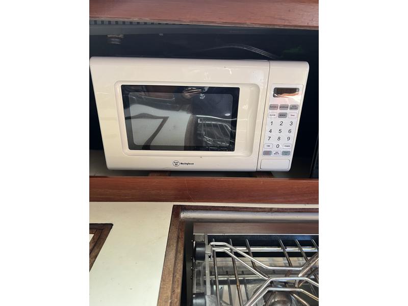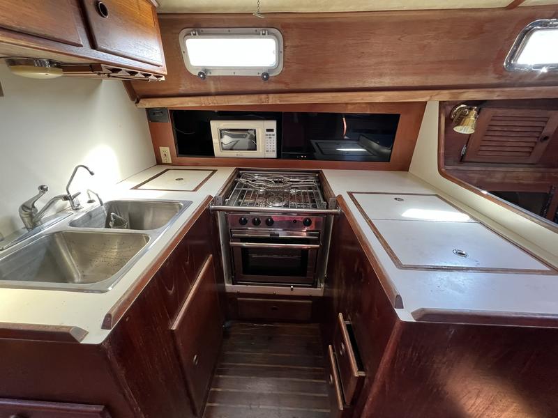 Galley: U shaped Galley Stainless steel double sink Refrigerator (parts purchased, need to be installed) Dry storage Microwave Cabinet and drawer storage Triple burner propane stove and oven