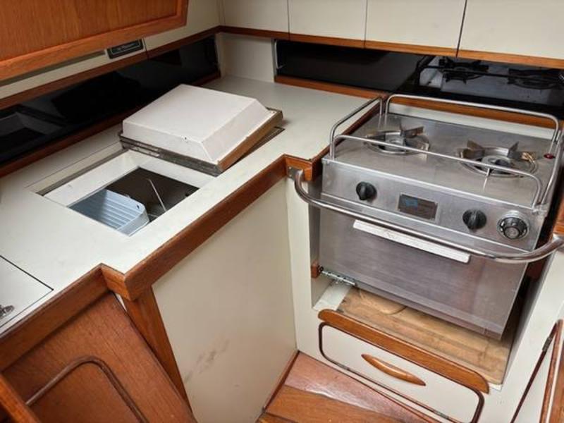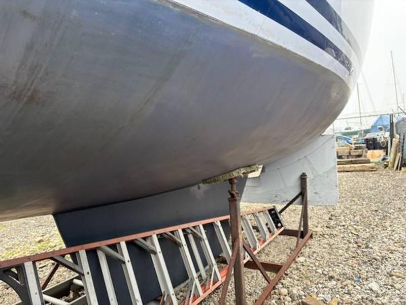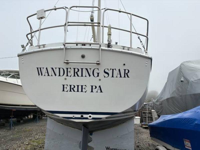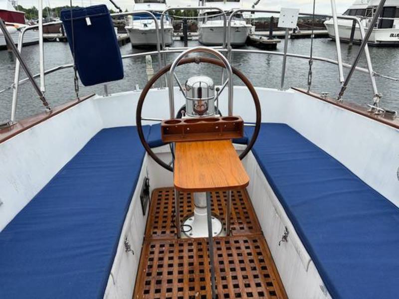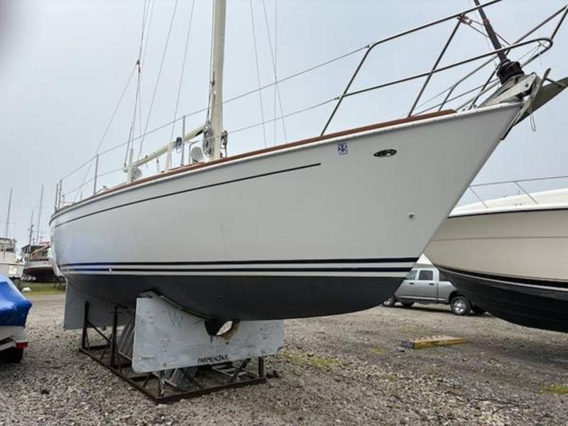 Sails include main, jib and spinaker. Beam-12 ft, draft-5 ft. Exterior teak refinished 2024, bimini added 2024, VHF radio 2022, three AGM batteries 2021 and Harken MK IV roller furler 2021. Inboard, 27 HP Westerbeke self-bleeding diesel engine with 50 gallon fuel tank. Knot meter, depth sounder and Raytheon autopilot. Electric head, two burner propane stove w/oven and 12 volt frig. Sleeps 5-6, includes original manuals and a cradle for winter storage. Easy to sail single handed.