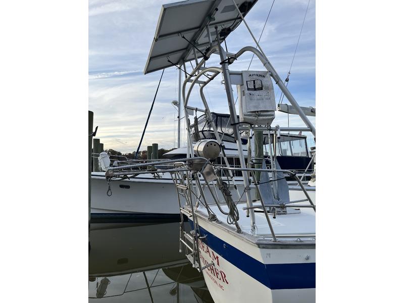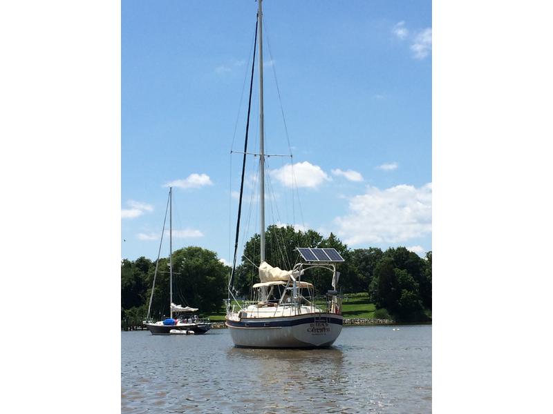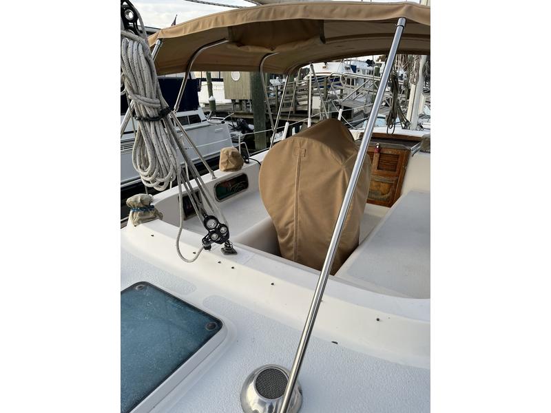 There is a windlass, autohelm, Garmin for navigation, radio, and a hand-held. The mainsail is full-batten and is furled in a stack pack. It has two reef points. The genoa is roller-furled, and the staysail is furled on a boom. She sails beautifully with a double-reefed main and partial unfurling of the genoa in 20-25 knots (like the trade winds). In that weather on the Chesapeake Bay she has been known to go eight knots. She sails to weather nicely.