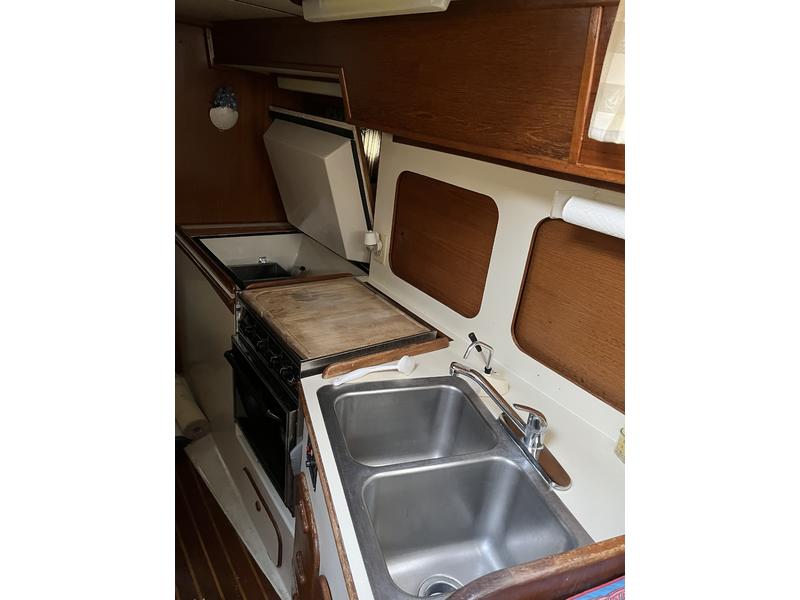 There is a chart table on starboard. The table surface opens, and there is an insulated ice box, but I have chosen to make that my pantry because there is a refrigerator/freezer in the galley. The refrigerator door opens from the top, which is perfect because in the hot summer you don't lose all the cold air when you open it, which a front-loader does. The inverter is on starboard. The galley on the port side has two sinks, propane stove/oven, microwave, and good storage space, with counter space above the engine.