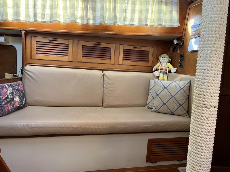 The main salon has two sofas, and it has a large dining table which is great when entertaining groups. I have mostly used the table in the cockpit for my regular meals. The main salon also has great storage space.