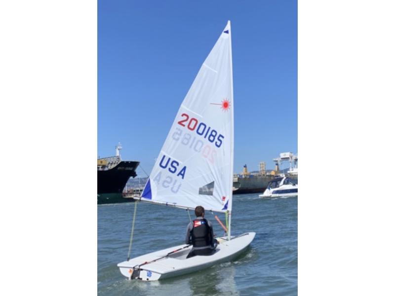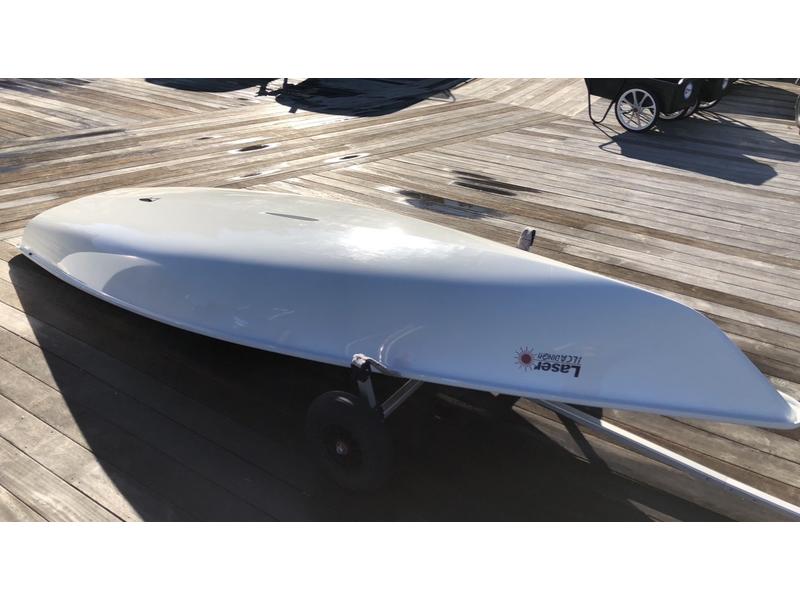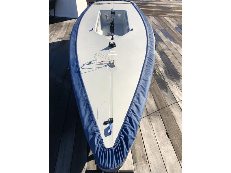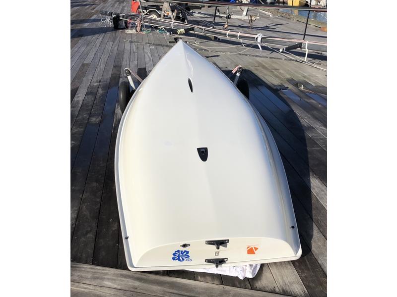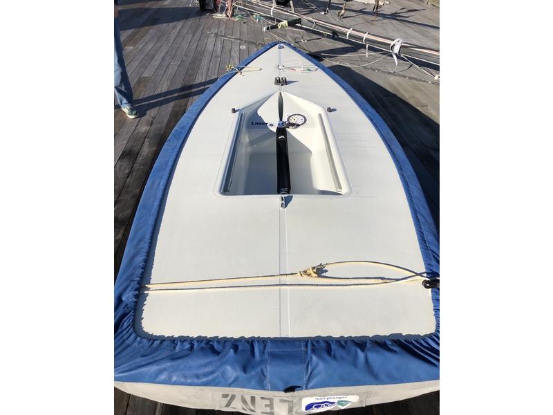 2012 Hull #200185. - Three full-rig Sails; one new race sail, two practice sails with extra battens. - Three radial sails; one race sail and one practice sail. - Carbon top section. - Radial and full-rig aluminum bottom sections. - Blades with a blade bag and extra carbon tillers. - Laser XD Race line kit. - Zhik hiking strap. - Top and bottom covers. - Dolly.