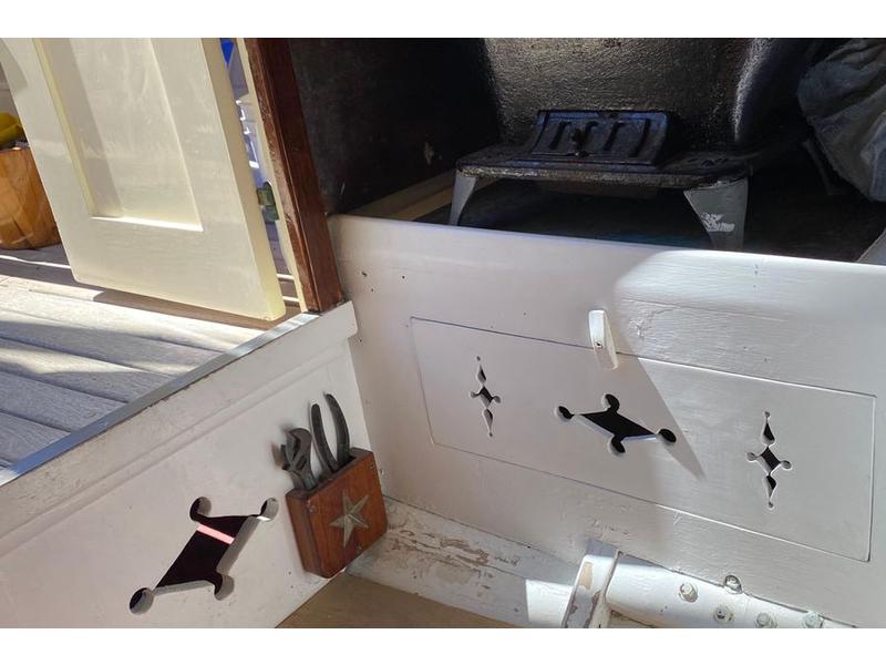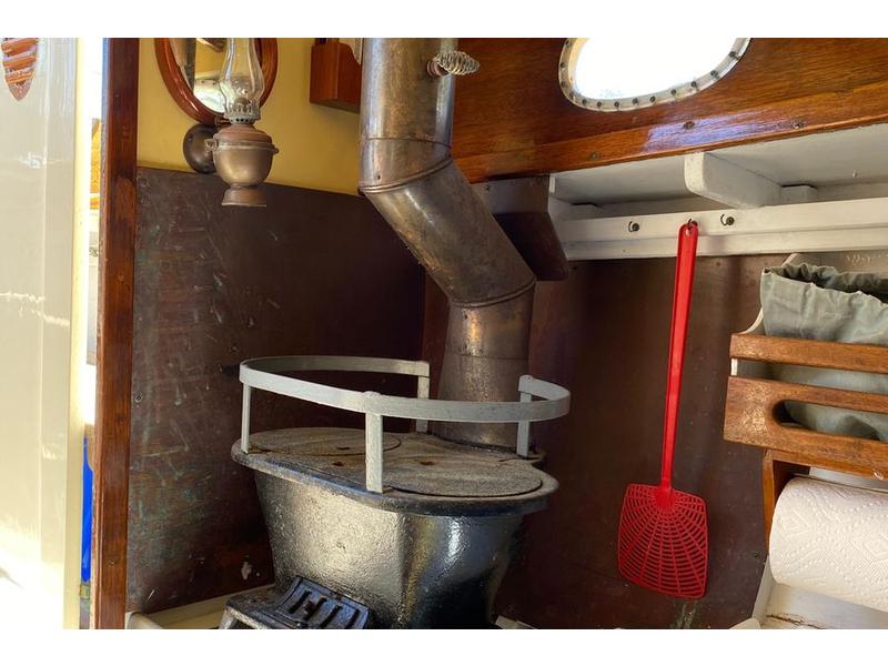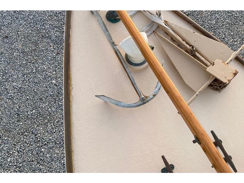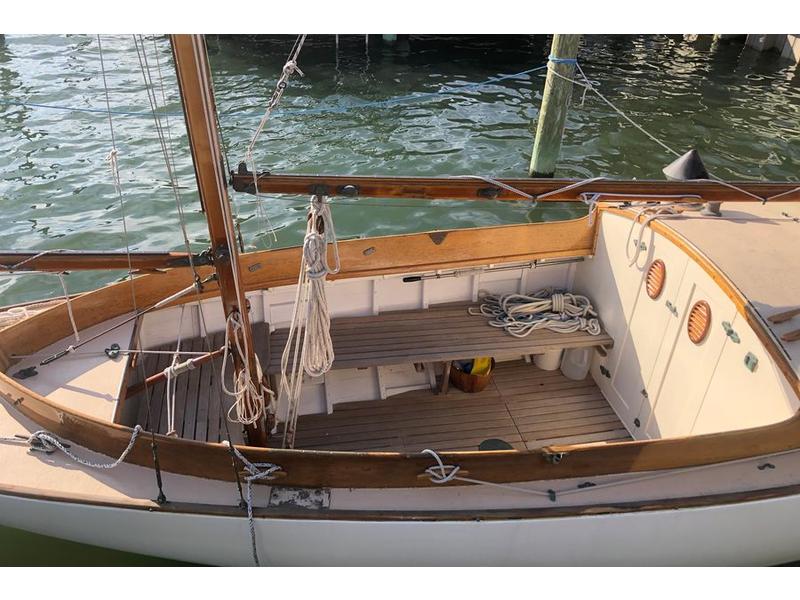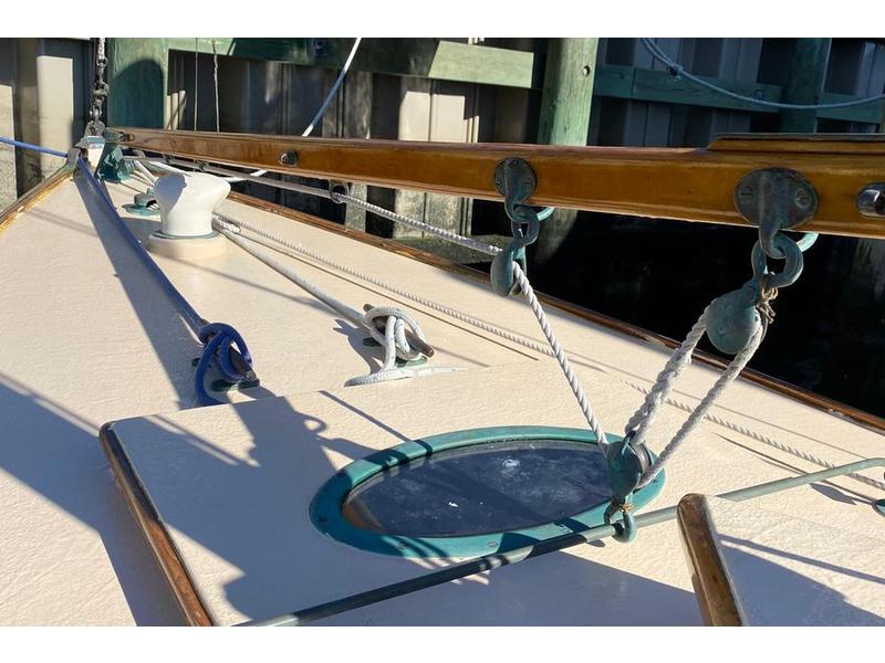 EQUIPMENT Bronze turnbuckles and 19 stainless standing rigging J.M. Reineck & Son bronze blocks Varnished mainsheet blocks Bronze ventilation cowls Endura braid classic rope halyards Edson bronze 1-1/2 diaphragm bilge pump Rule electric bilge pump 12V Battery and 100 watt charging solar panel (2022) 10-foot sweep oar and oarlock 5-inch Danforth Constellation compass with stowage mount Radar reflector Boom vang tackle Bronze jib sheet winches and pedestals (stored ashore) Two ash non-fouling pennant staffs Brass oil lamp Perko gimballed oil cabin lamp Mahogany/bronze boat hook Two canvas covered fenders Array of dock lines 14 lb Danforth anchor 14 lb Fortress anchor Two 120-foot 5/8 nylon anchor rodes Safety: 6 life jackets Flare kit Required pollution placards Bronze bell |