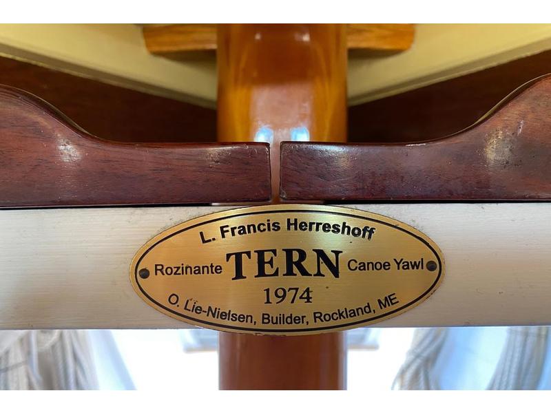TERN, a Rozinante, is as beautiful to look at as she is to sail. Her self-tending jib with all halyards and sheets leading to the cockpit make her easy to sail. Her tall ketch rig makes her an impeccable light air boat, yet her fifty percent displacement to ballast ratio make her comfortable and secure in all conditions. Designer: L. Francis Herreshoff, design #98 Rozinante. Builder: O. Lie-Nielsen, Lees Boat Shop, Rockland ME.