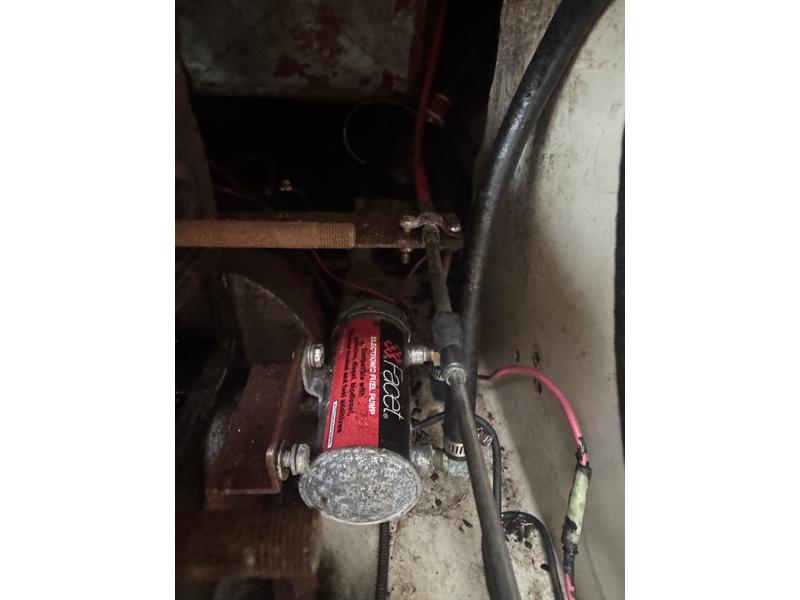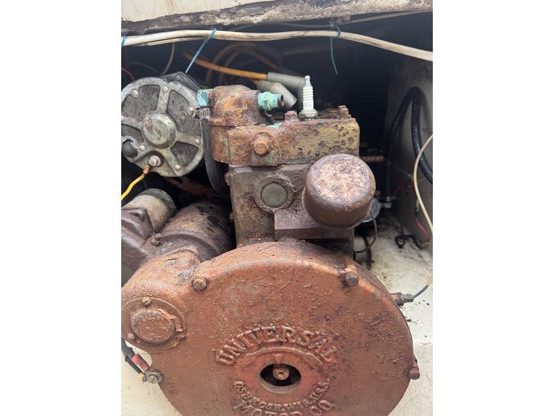 The Atomic 4 inboard engine turns over, with a working starter and alternator, plus a newly installed electric fuel pump. However, we havent been able to get it running, so it will need further troubleshooting, rebuild, or replacement. Luckily, this engine is easy to rebuild with plenty of parts available.