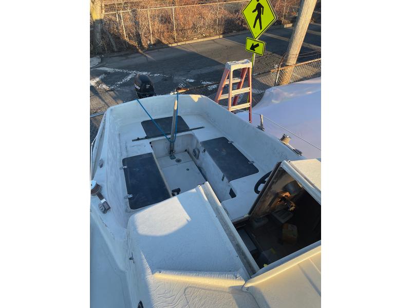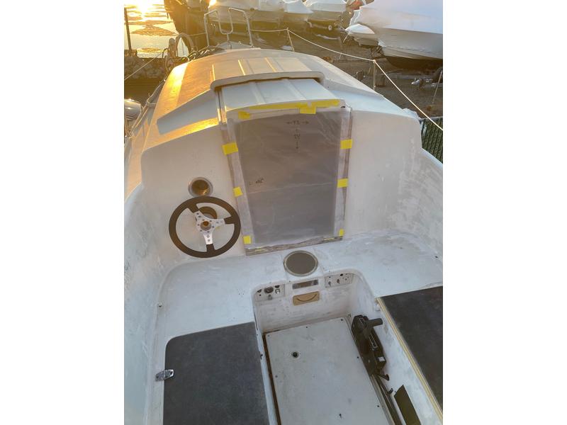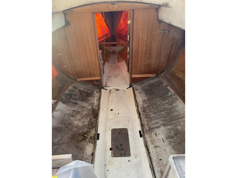 Mast and Rigging: Ian Proctor extruded aluminum mast. Proctor rolling boom includes gearbox and crank to roll mainsail onto boom for reefing Mast step was professionally reinforced Stainless steel standing rigging was replaced about ten years ago. Ground Tackle: Two Danforth 25 # anchors, each with about 20 feet of 3/8 chain and 75 feet of braided nylon rode in very good condition Galley: Galley includes a new, gimbaled two-burner Origo alcohol stove, two small stainless steel sinks with foot pumps, and an icebox. Handy cabinets above counter hold plates and cutlery, etc, and table can be installed in the cabin or in the cockpit. Freshwater tank holds 15 gallons. Head: Nearly new Thetford Porta-Potty in forward cabin has convenient removable tanks. Electric System: 12 Volt electric system includes new two battery set-up including new second battery with new battery switch, battery box, and new wiring connections to motor wiring and boat wiring. Mast electrical harness and navigation and deck lights have been replaced. New lighting switches, new Blue Sea DC distribution panel and new Ancor marine grade wiring and connectors are included with sale but are not yet installed. New Rule 550 Automatic Bilge Pump installed. |