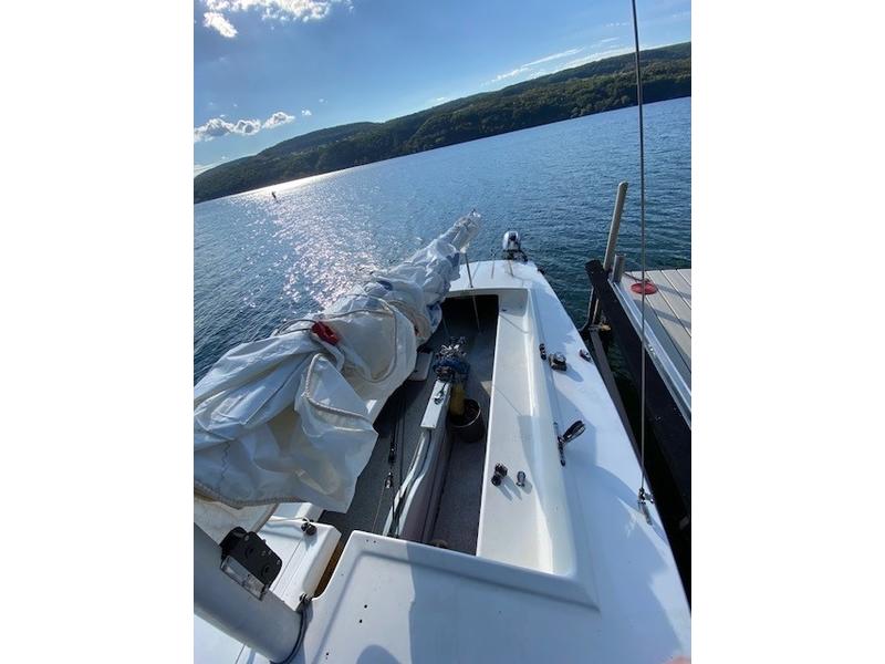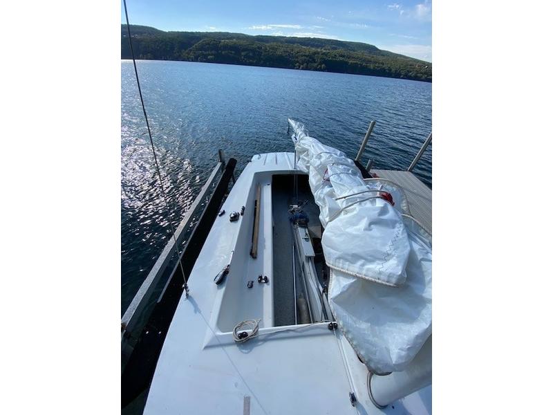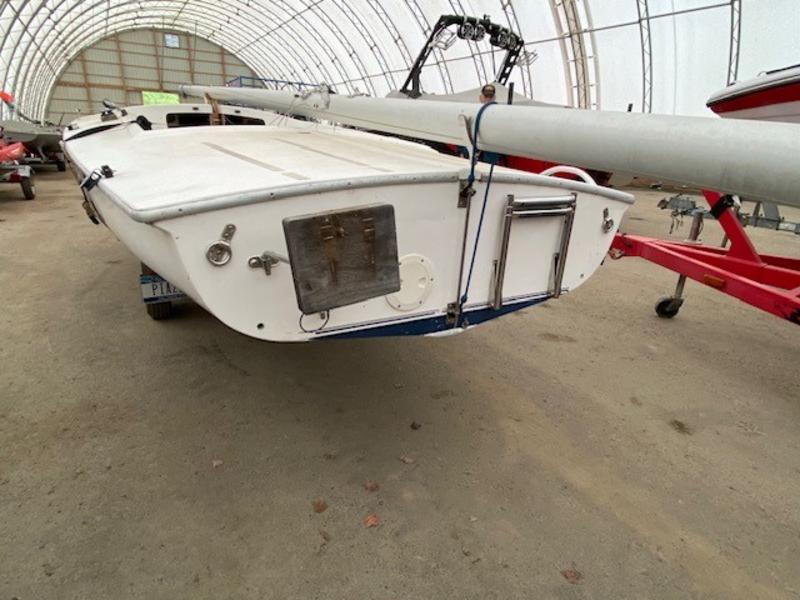 Very nice, clean Flying Scott, #5258 well maintained, always sailed in Fresh Water. N.Y. Finger Lakes, & PA inland lakes, includes: Newer Main & Jib, colorful Spinnaker w/pole, Mad corner pocket, nearly new Honda motor, less than 10 hours, 1 year old boat cover, trailer with new spare, Recently added motor mount, Swim Ladder and grab rail. bungee ring system, to keep mainsheet from tangling with motor. Boat has always been stored indoors for Winter. Boat is currently in storage in Grove City, PA. Many additional photos available upon request. |