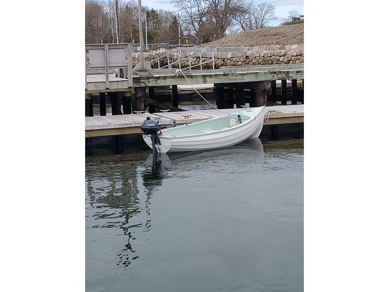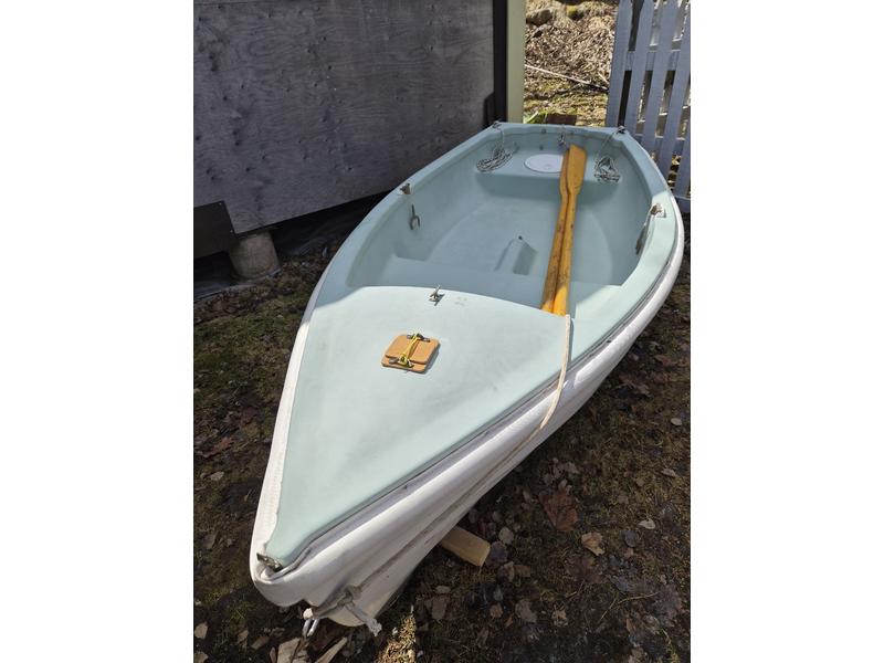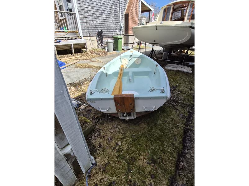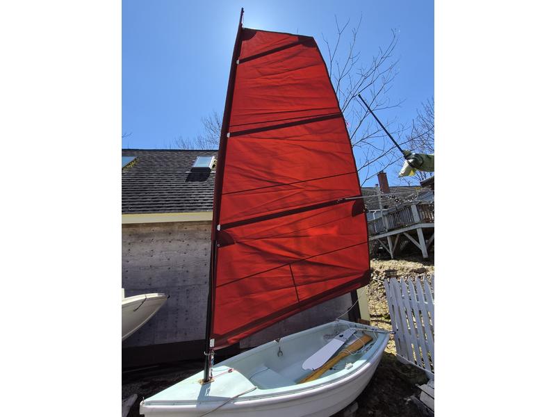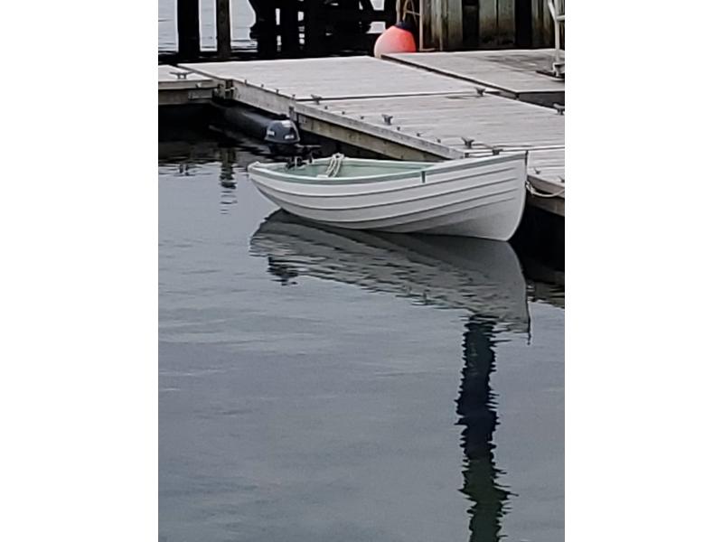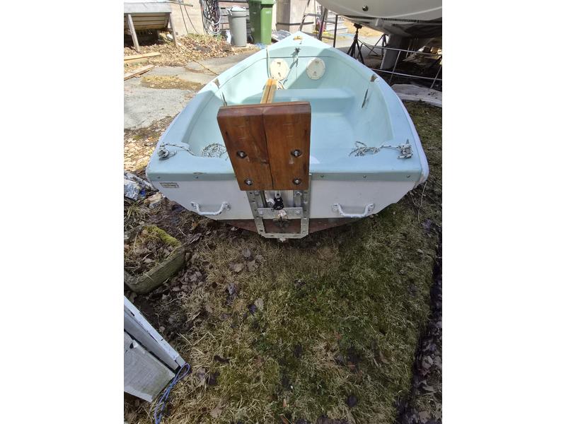 All fiberglass lapstrake 10' 5" dinghy. Internal foam flotation make it unsinkable. Brass oarlocks with wooden oars. Full length stainless steel keel plate. Full length gunnel guard style bumpers. Fully retracting stainless centerboard. High performance rudder and tiller. Two piece carbon fiber mast. Boomless full batten Dacron tanbark mainsail with square top and one reef point. Main halyard, downhaul, main sheet and associated blocks. Bottom painted with Interlux red antifouling. Lifting outboard motor bracket. No outboard motor included. Boat is in excellent condition with the exception of a few surface scratches port side near the bow. This dinghy is a great performer rowing, sailing or motoring and can handle a good bit of rough water. Built by Cavanagh Fabricators in Kentville N.S. Will deliver within 100 km. Make an offer. |