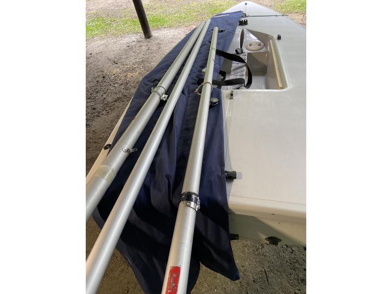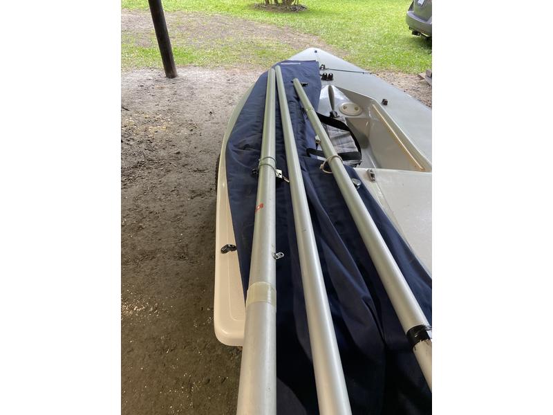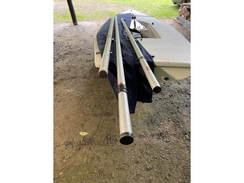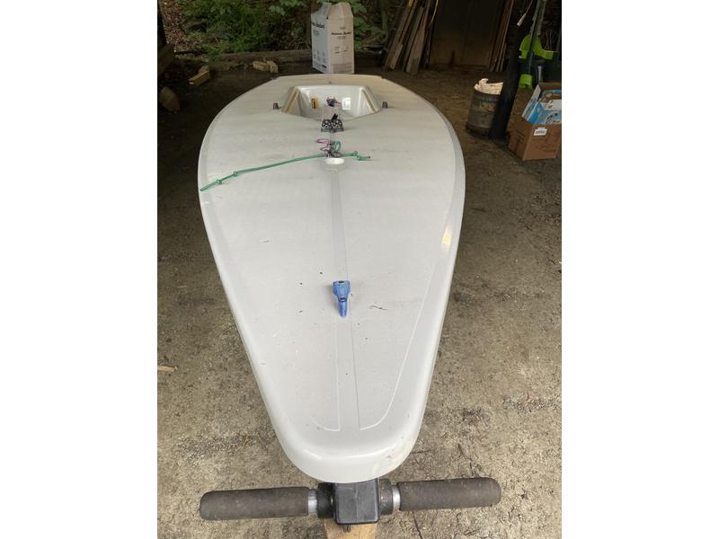14' Laser sailboat in excellent condition. Always stored under roof and has top cover in good shape. Hull is sound with no leaks. Includes two tillers- one original the other is extended carbon. Boom and mast are in good shape. All rigging is included along with manuals. Comes with two sails. A very nice, well kept sailboat in good condition. Includes dolly trailer. Health reasons are forcing sale.