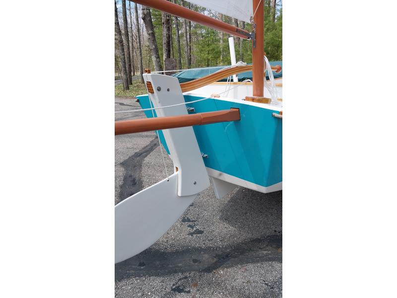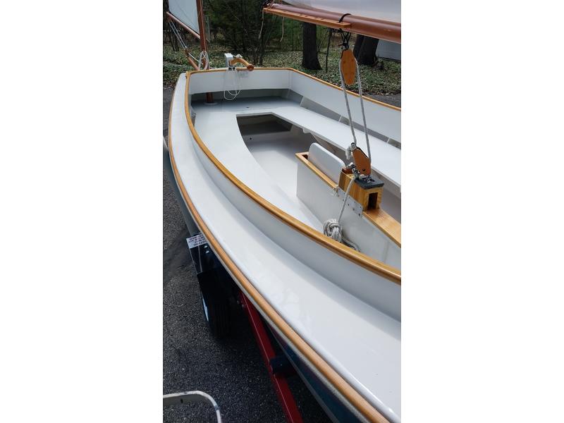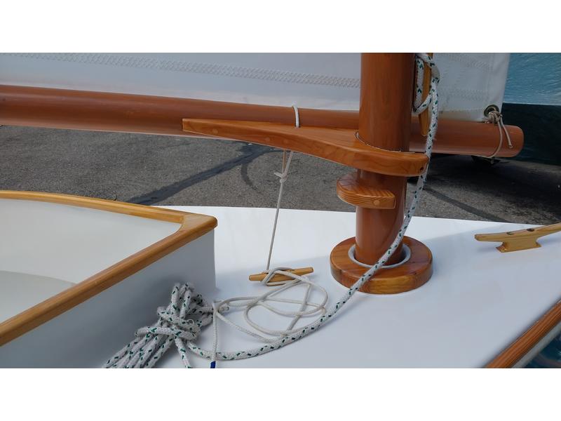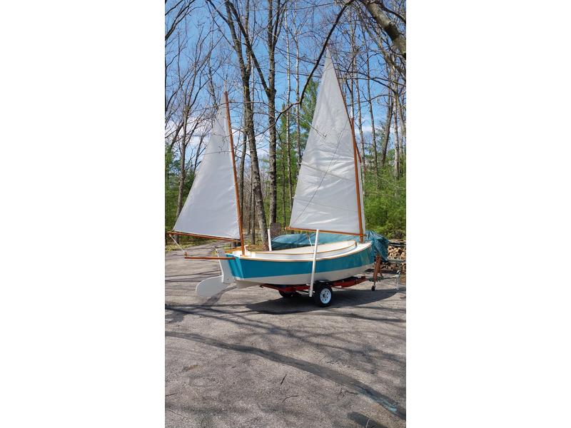 Construction consists of plywood and epoxy with a "double bottom" that ensures positive flotation. Spars and trim are douglas fir. As well, the boomkin is removable. The hardware and blocks are custom built. Includes custom-fit new trailer.
