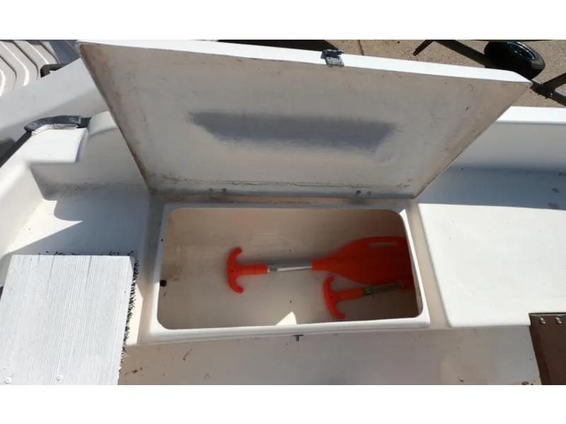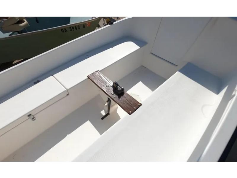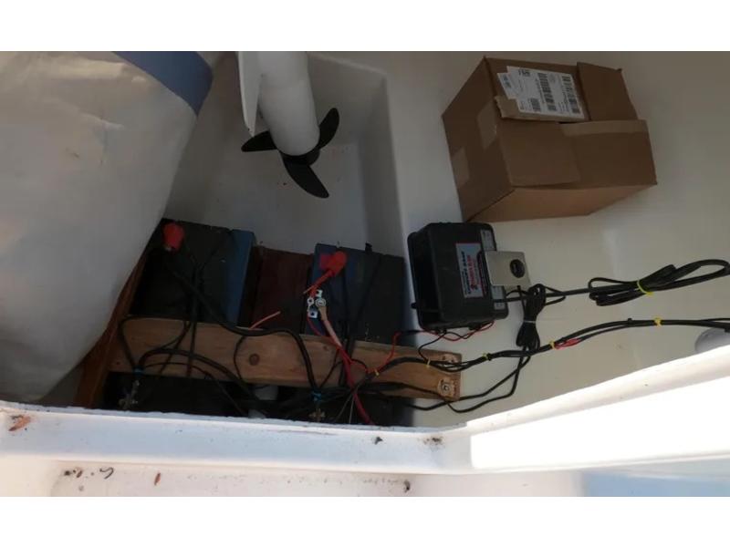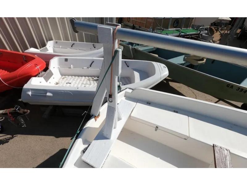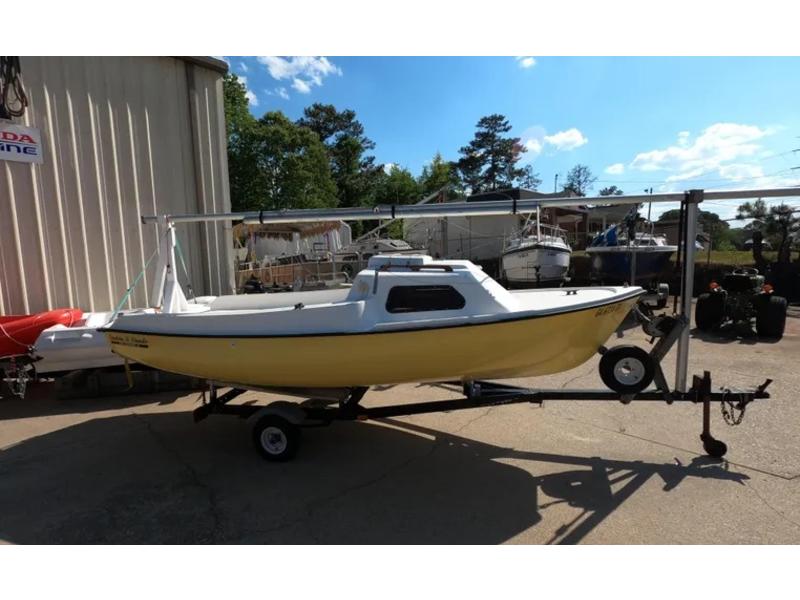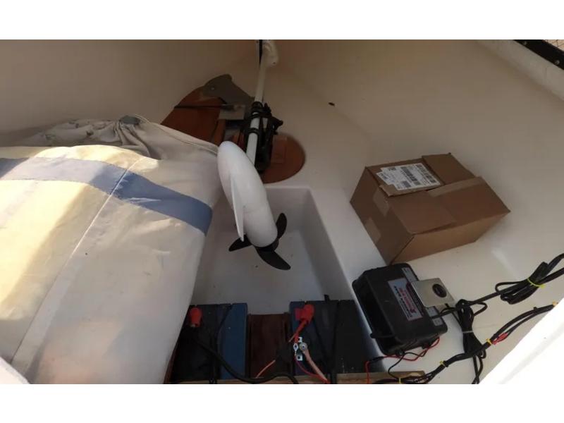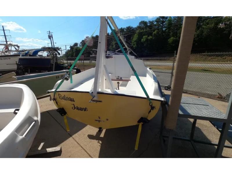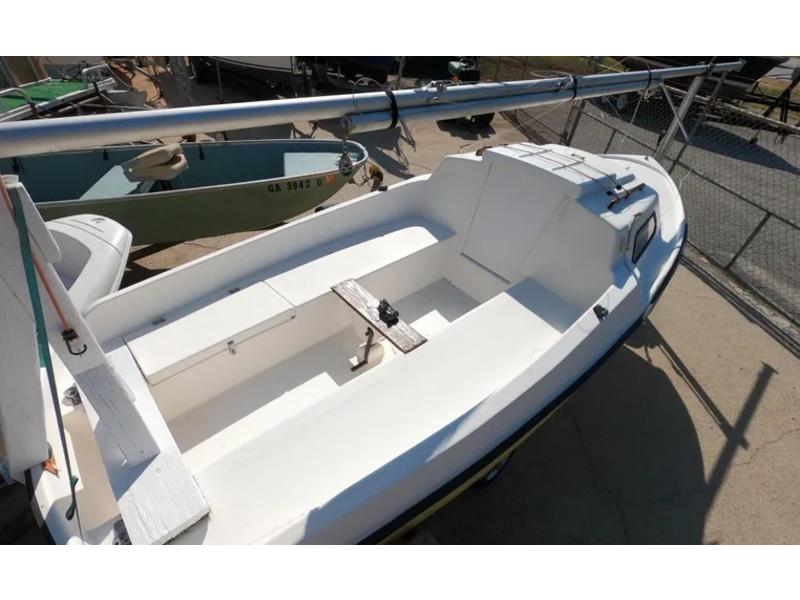 Cabin: The cabin is small, providing about 48 inches of headroom, suitable for sitting but primarily used as a "tent you don't have to set up" for sleeping. Sleeping: Offers a V-berth in the bow and two quarter berths, accommodating two adults comfortably, or a small family in a squeeze. Storage: Limited, though some owners add custom hatches for storage Additional Single axel trailer in good condition with newish tires Spare tire mounted on trailer Custom crutch to support mast and boom Paddles in lazarette Two 12 volt batteries with charger Electrical connection on hull with button to check battery charge Good Sails and Running Rigging |