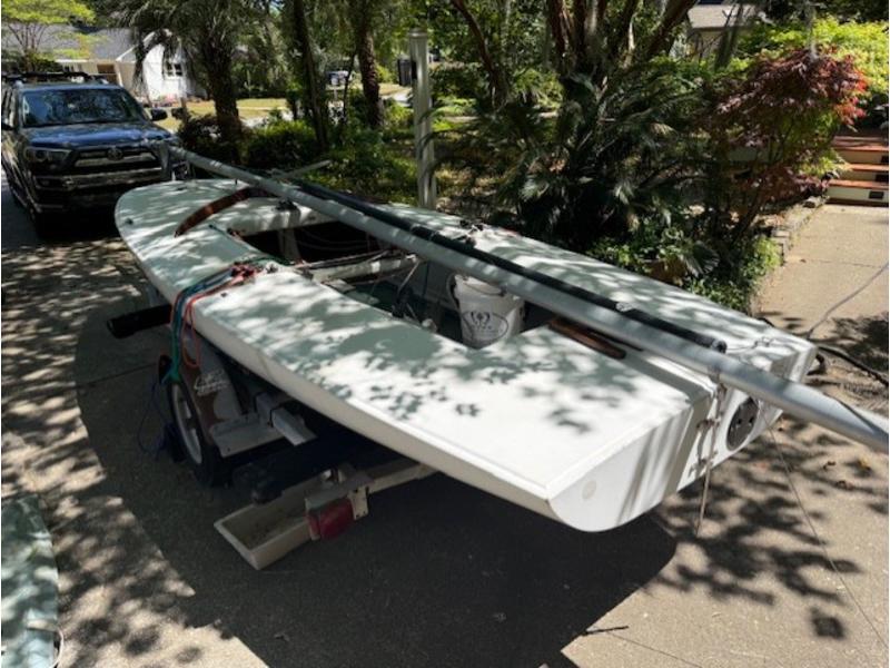I am selling my 16-foot MC Scow Sailboat. #1342. I have raced this boat many times, and it is a solid and fast boat in great shape. Made by Melges Boat Works. It comes with two sails. One practice sail and one new racing sail, a galvanized trailer with new bunks, a hoist bridle and a really nice mooring cover. Additionally, a mahogany splash guard, tiller with mahogany tiller handle and extension. New boats sell for 25K without trailer or cover. Make me an offer!! |