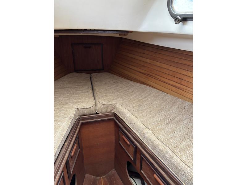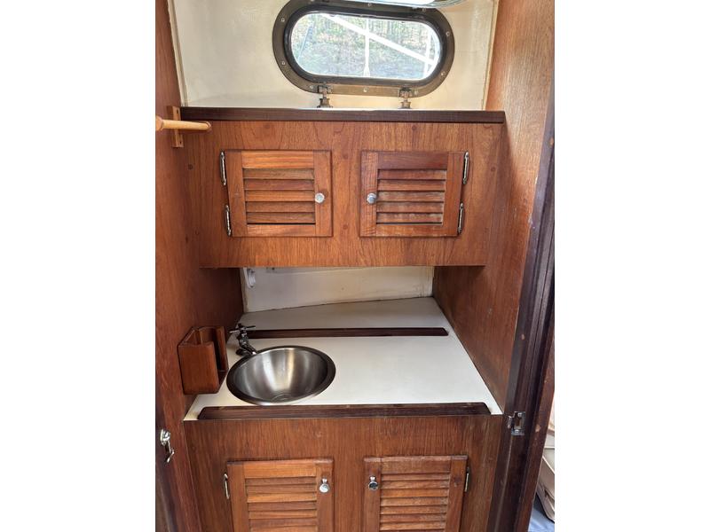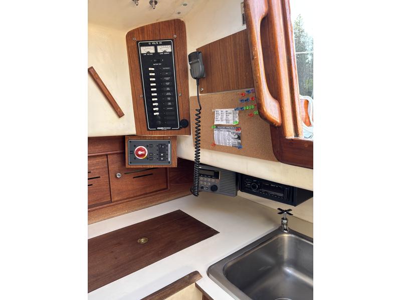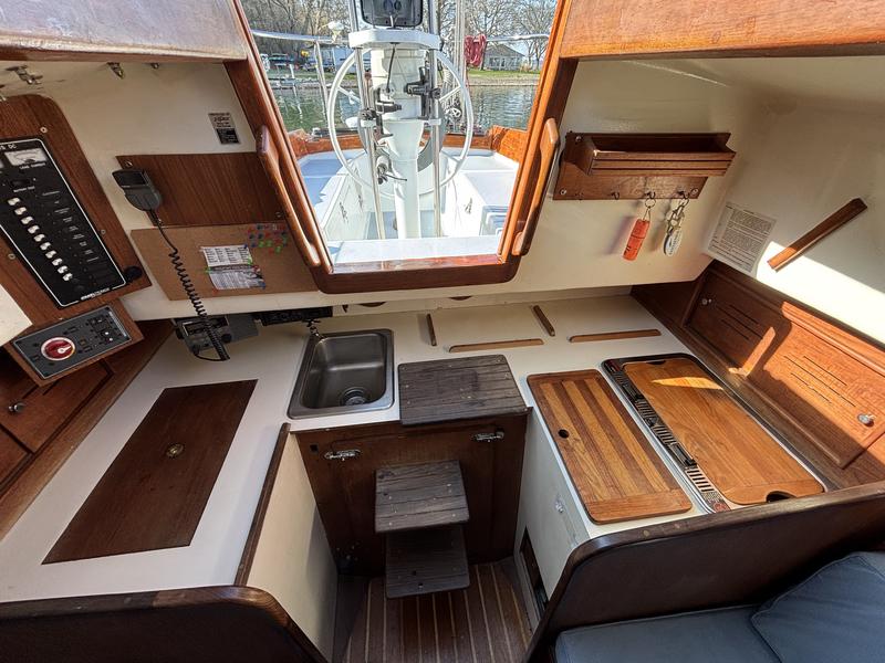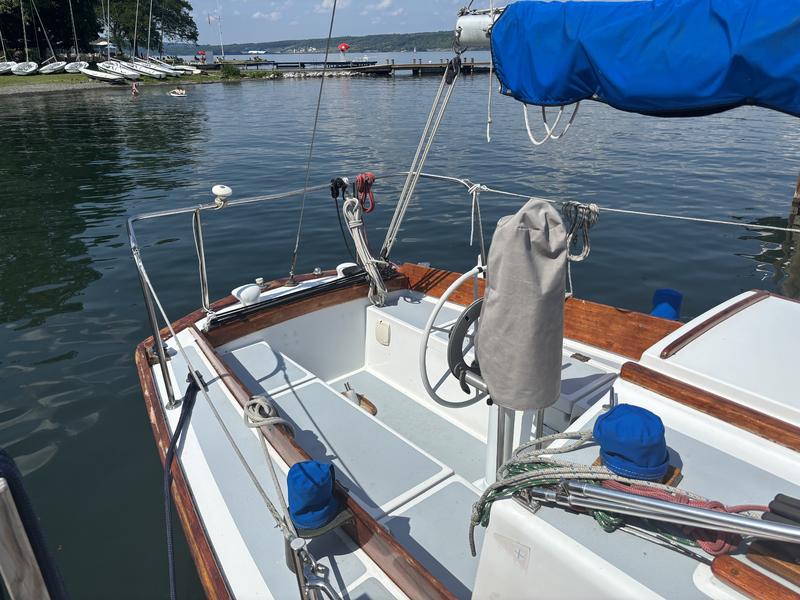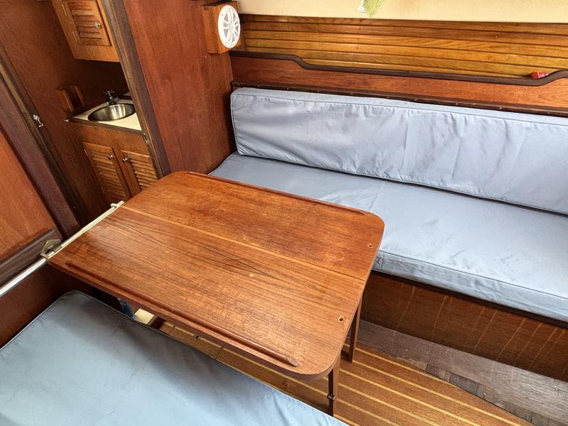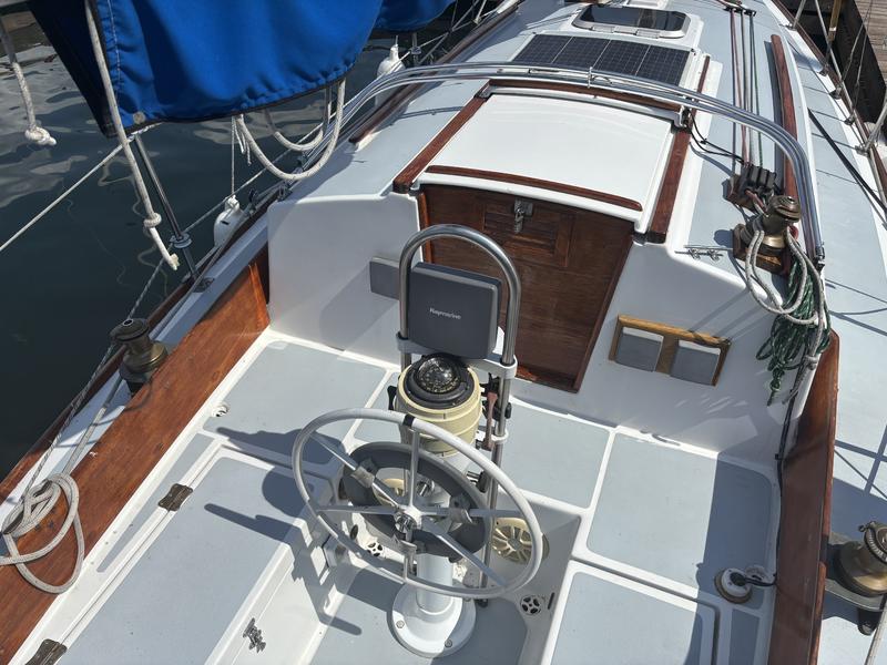 FRESHWATER boat, dry storage, shrink wrapped 6 months of the year. Edson wheel steering. Lines run back to the cockpit for easy single-handing (only genoa halyard at the mast). Original bronze portlights. Royal blue Awlgrip paint on topsides. Transom repainted in 2022, ready if you want to rename the boat. Antifouling with interlux product in 2026. Anchor plate reinforced with 2 stainless steel backing plates (2022).