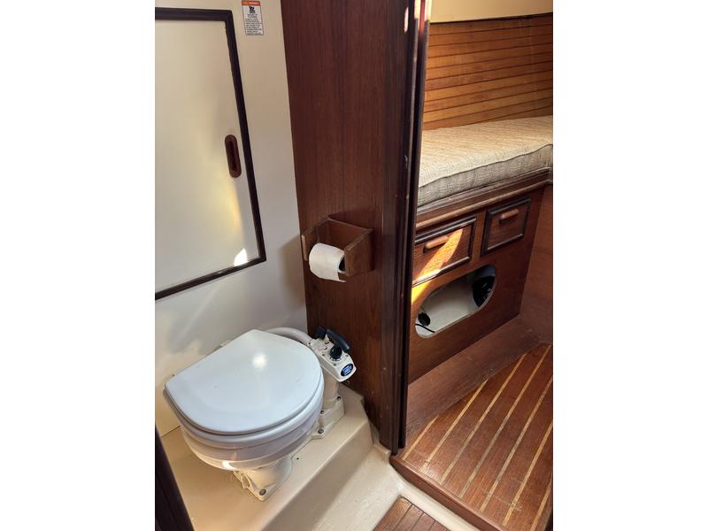 - Jabsco marine toilet connected to black water tank under V-birth