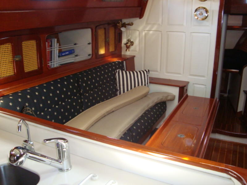 The main cabin is very large, with folding drop leaf table and plenty of seating. Forward is a second head, forward of this is a V-berth.