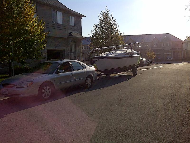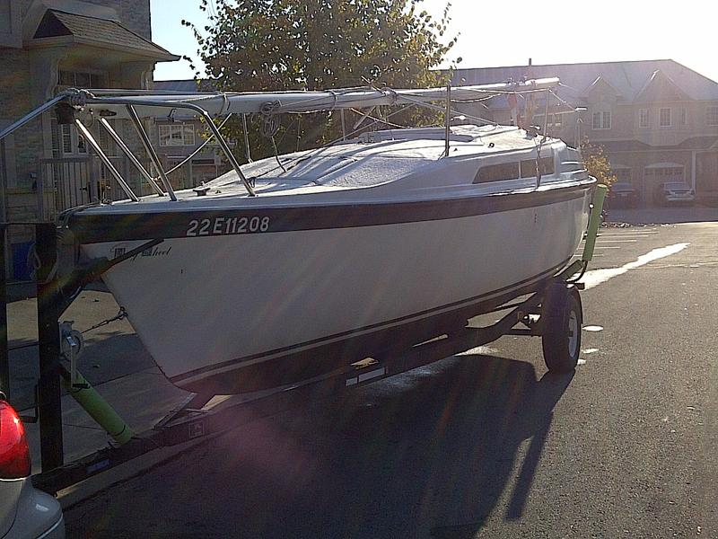 - Single axle boat trailer. BRAND NEW tires/rims with BRAND NEW LCD lights. Installed OCT 2011. - Main sail, jig, storm jib, and spinnaker and Genoa - Manual bilge pump - Pop-top tent - VHF Marine Radio Radio - Mariner 8 hp outboard - Electric Auto Tiller - Anti-fouling paint applied in 2010, - Newer battery - Single burner alcohol stove - Fire extinguisher - Mast raising system. - Roller furling - Life Jackets/PFDs and extras.