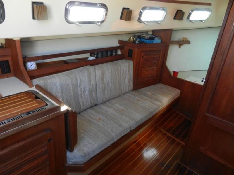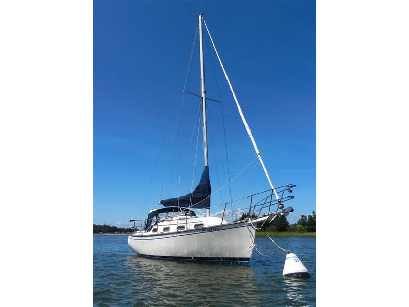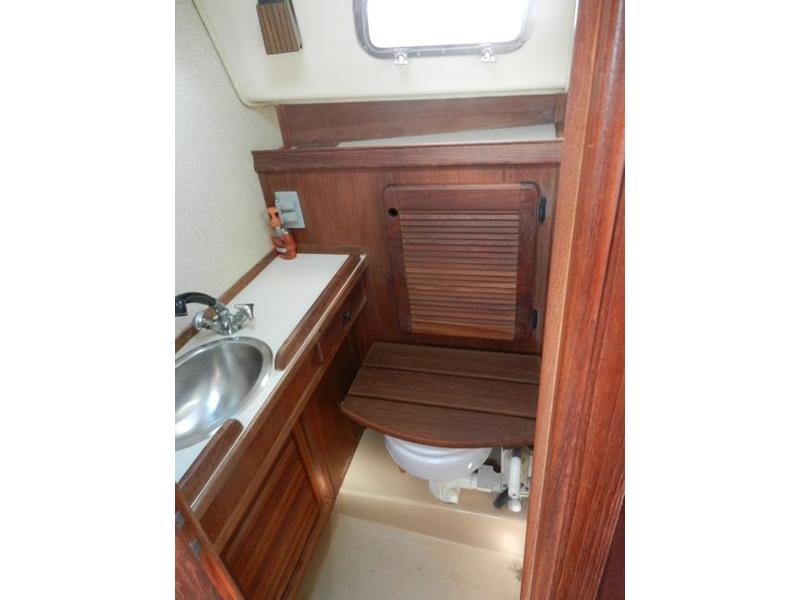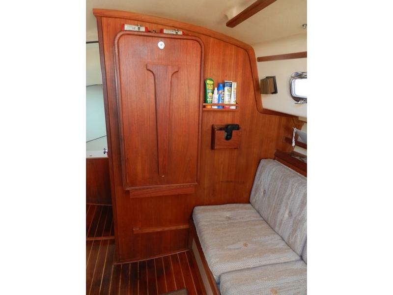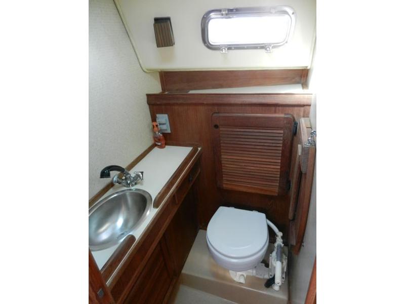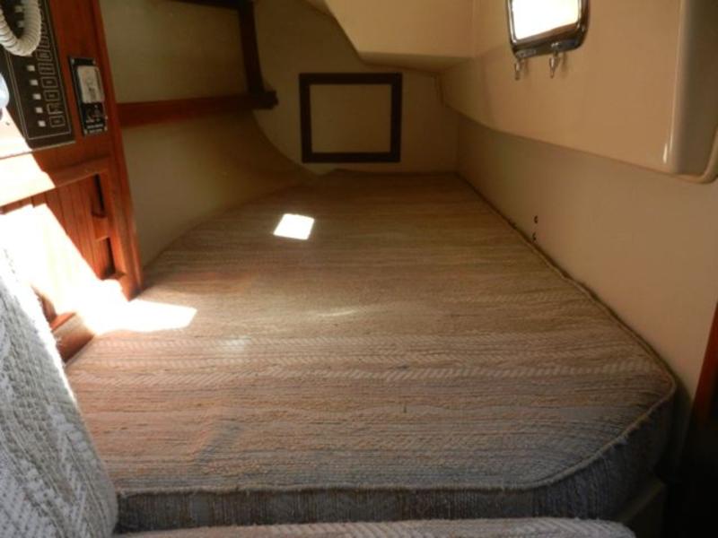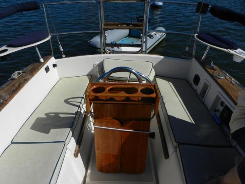 All standard original equipment, 1 new battery, new polyethylene waste holding tank 2012. We re-glassed the fresh water tank in 2012. Two Zarcor stern perch seats designed for this model, roller furling jib, lazy jacks, a traveller rig, auto pilot, dodger, all orig. interior cushions, plus cockpit cushions in VG cond., properly winterized, shrink-wrapped, bottom painted, buff and waxed annually. Sails and runs great. Only 488 engine hours. please email or call for more pictures. |