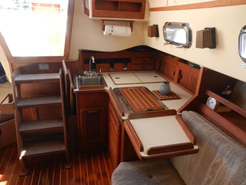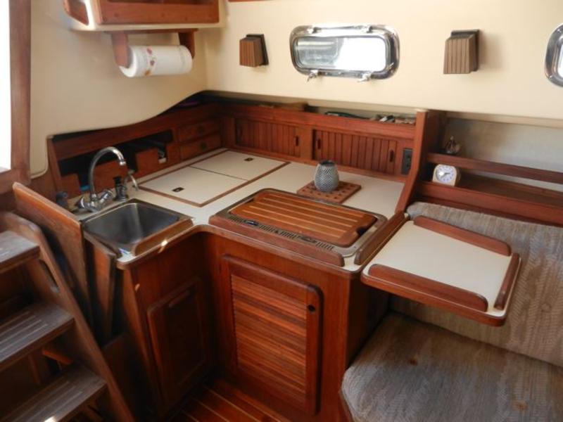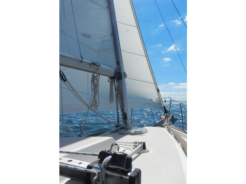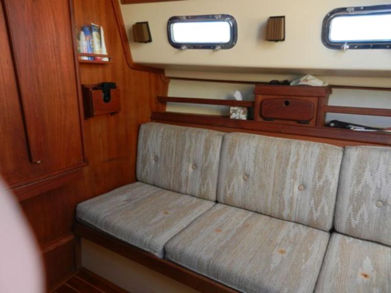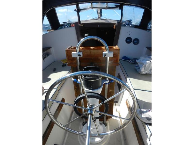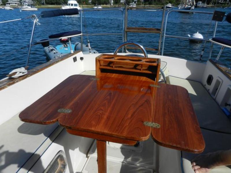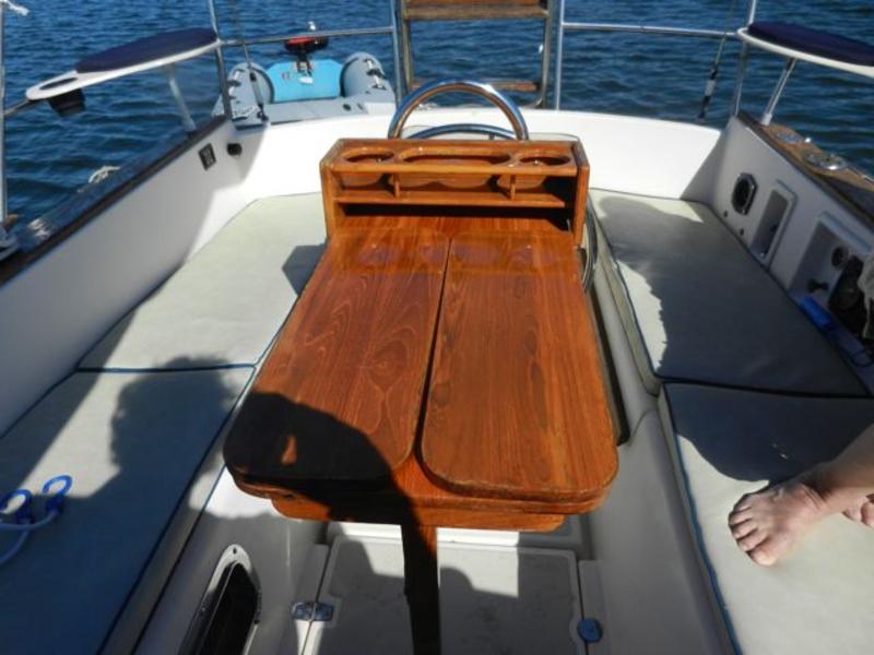 All standard original equipment, 1 new battery, new polyethylene waste holding tank 2012. We re-glassed the fresh water tank in 2012. Two Zarcor stern perch seats designed for this model, roller furling jib, lazy jacks, a traveller rig, auto pilot, dodger, all orig. interior cushions, plus cockpit cushions in VG cond., properly winterized, shrink-wrapped, bottom painted, buff and waxed annually. Sails and runs great. Only 488 engine hours. please email or call for more pictures. |