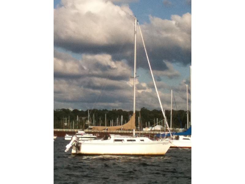 Ready to sail with new roller furling. 2001 Honda 4-stroke engine (less than 100 hours). Can sleep six with roomy cabin. Skirt for when top is open with 7′ headroom. Has new depth finder, compass and private toilet area with running sink and porta-potty. Many features and extras