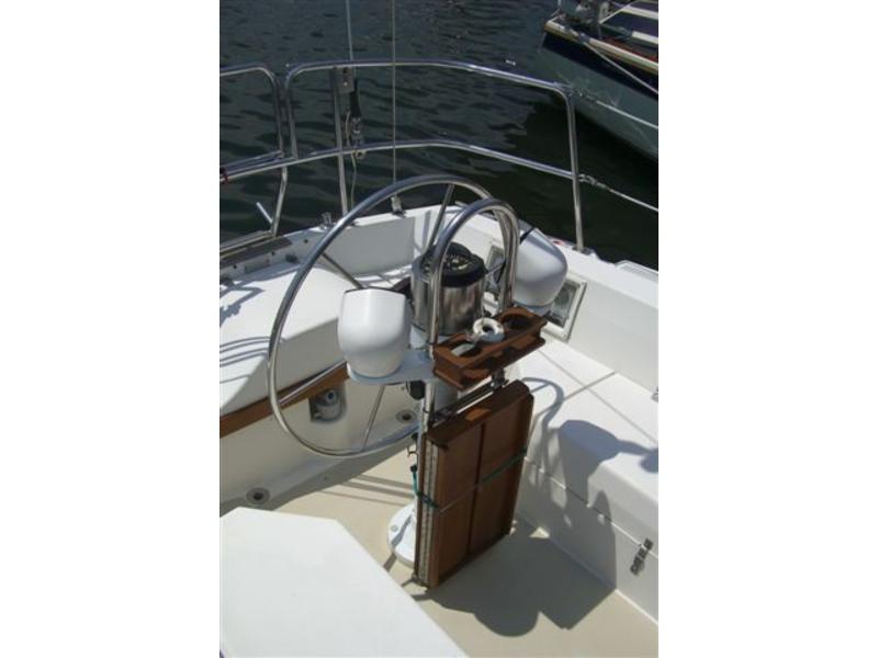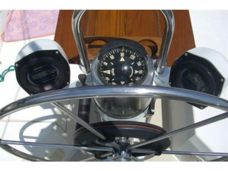 STS Bow pulpit Anchor locker Double sts lifelines w/ gates Stern Pulpit Teak handrails on cabin top Large opening hatch Nine opening ports Four large fixed ports Light blue nonskid on white deck White gel coat topsides in nice shape Lewmar 46ST 2 sp primaries Lewmar Cabin top winch(2) Keel stepped mast Fold up boarding ladder on transom Bimini top and almost full cockpit enclosure Cockpit cushions