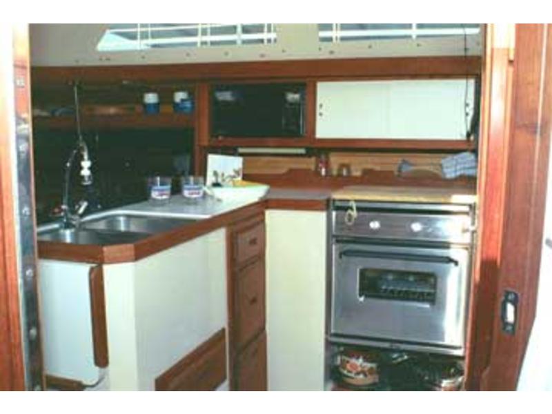 2 Burner gimballed propane stove w/oven Large ice box with cool plate Ample dry storage Double, deep stainless sinks on center H/C pressure water microwave Ample storage outboard and under counter
