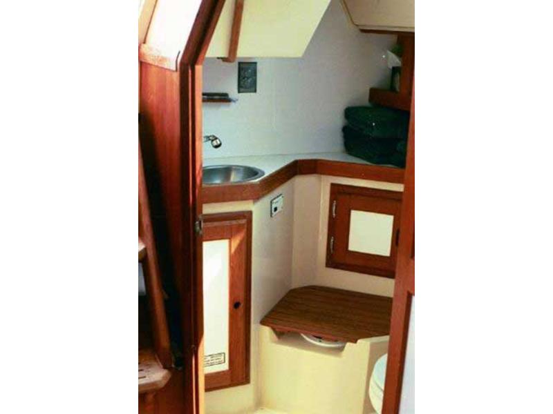 Large marine head with Vanity H/C pressure water at tap Marine head (Electric Pump) Teak shower seat Smoked plastic cabinet slides to keep incidentals dry