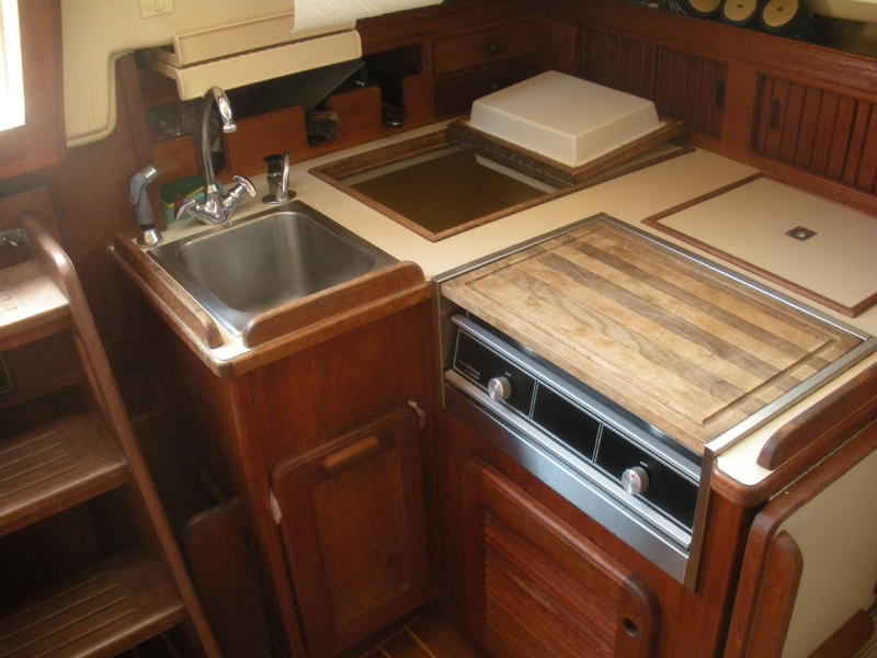 Galley * Ice box - top loading, heavily insulated w/injected froth foam, lift-out shelf, 9 cu. ft. volume * Gimballed, LPG, two burner stove - S.S.construction, teak cutting board cover * Large locker under stove w/louvered teak door * Deep S.S.sink w/hot & cold pressure water tap & manual pump * Hide-away trash bin * Deluxe teak dish rack & cutlery drawers