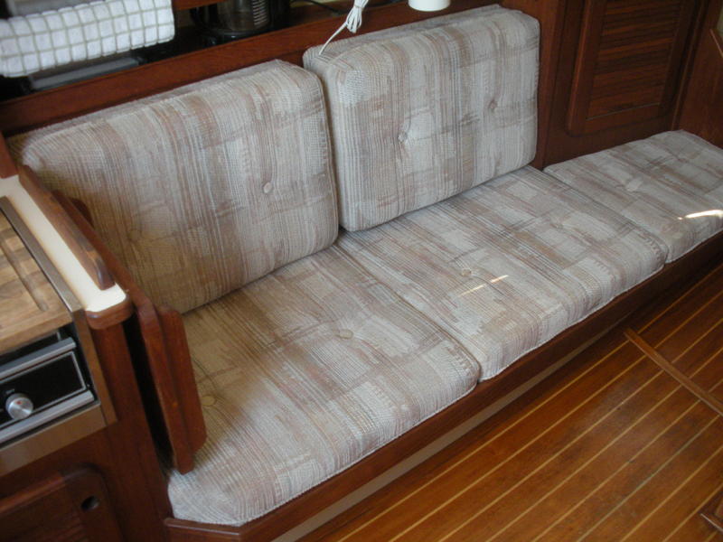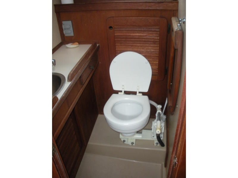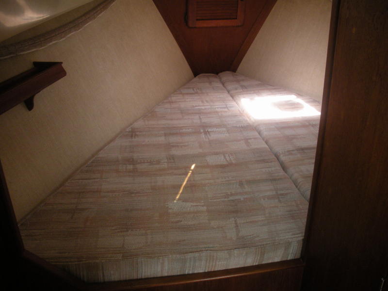 Interior * Head compartment w/full fiberglass draining shower pan. hot & cold pressure water w/shower, curtain & teak seat ( seat lifts up for access to marine head), large vanity cabinet w/s.s. sink, drawer & shelves, teak framed unbreakable mirror, large cedar lined locker w/shelf over, Formica@ counter & bulkhead surfaces w/teak trim, opening port, overhead hatch, teak toothbrush holder w/cup * Main salon w/pull-out double settee berth to starboard w/teak cabinet & book shelf over. Single settee to port w/teak cabinet forward & book shelf over. Stowage behind & under each settee. Large teak drop leaf table folds against teak bulkhead rack * Large Quarter berth w/teak nav/electronics cabinet w/master AC/DC electrical panels. Full length teak shelf. * All cushions 5" thick foam