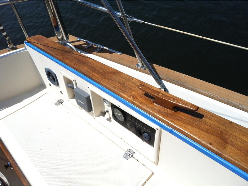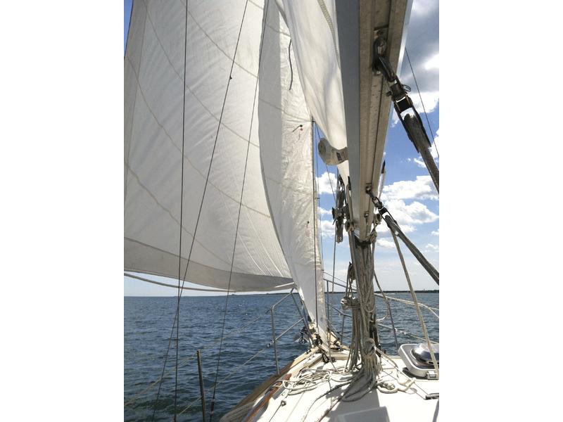 Rig, Sails, Hardware *All new running rigging 2013 *Sails: Main w/double reef, & 130% roller furling genoa, all triple stitched * Genoa gear, including tracks, blocks, sheets & Harken@ furling system *Jib halyard winch on mast, Lewmar@ 8C *Main halyard & main sheet led to cockpit through stoppers to Lewmar@ 16CST winch *Single line “Auto Reefing” system for double set of reef points led to cockpit through stoppers to Lewmar@ 8C winch *"Dutchman" Main sail stacking system *All halyards internal; color coded running rigging *Winch handle - IO” lock-in chrome *Main sheet traveler w/roller bearing car, adjustable stops *Welded S.S. double bow rail & stern rail, stanchions *Wheel steering - Edson@ rack & pinion w/molded seat, teak cover, S.S.wheel, brake *Topping lift-adjustable * Nine opening ports w/screens - polished s.s., safety glass. *forward vee berth with privacy curtain that extends to close off forward cabin.