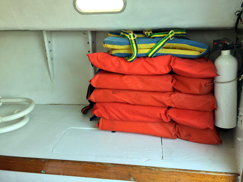 Sails are old but in good condition and cared for: - 2 Main sails, - 2 Genoa #1 (one for heavy air), - Genoa #2, - Storm Jib, - 2 Spinnakers Outboard Suzuki-98, 2 strokes, 4HP. Compass Bilge pump Navigation lights 2 Anchors VHF Radio with charger and on-board cradle 12V Marine battery with 110V charger Fire Extinguisher Life Jackets Outboard ladder Boat cover Storage tarp