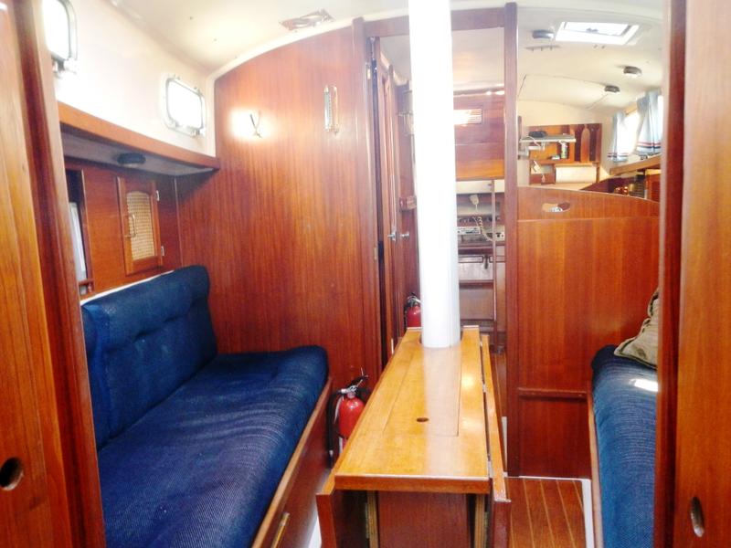 The 32 is a family cruising boat, and has a unique interior design: most sailboats have a double berth in the bow area called a v-berth, but this one is built with a shorter storage area forward and the main cabin pushed forward, allowing a good size galley and head and good size berths aft.