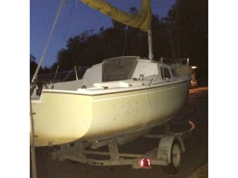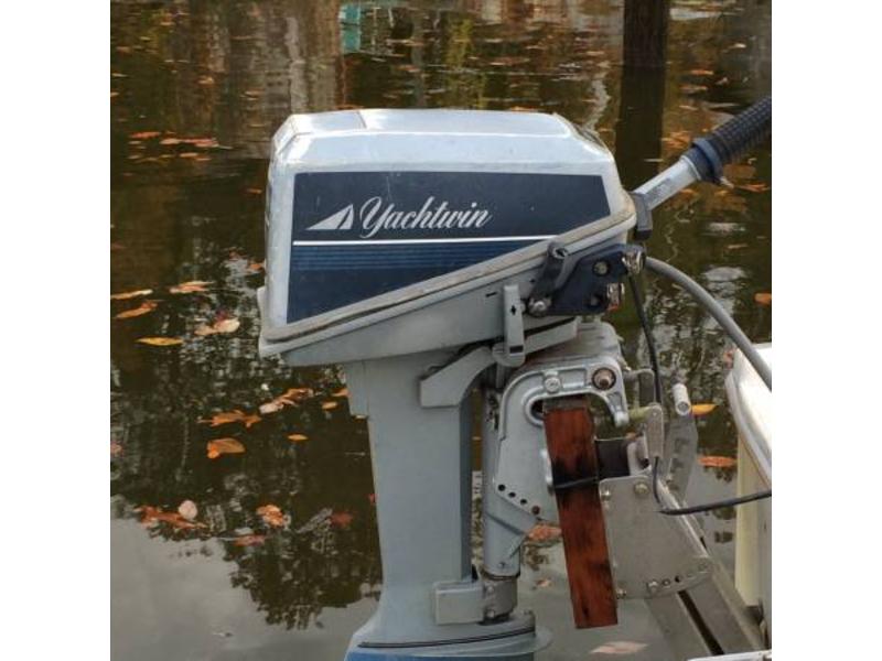 trailer, camper top, 5 sets of sails, Evinrude Yachtwin 8 hp (runs good), and a grill. |