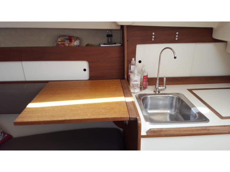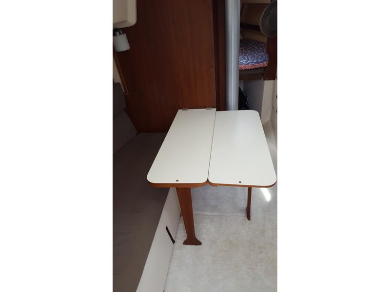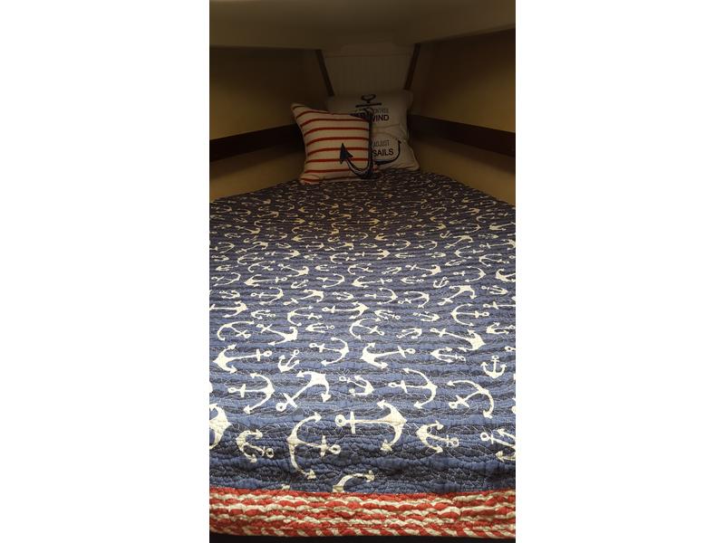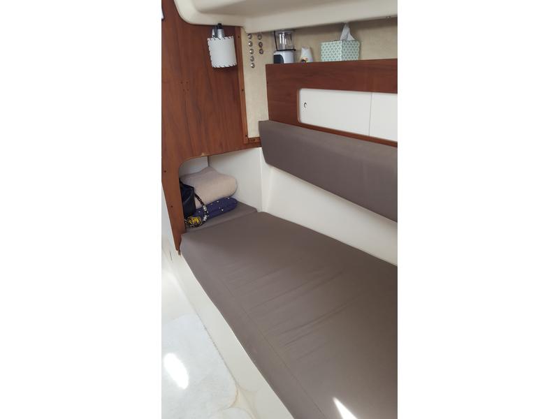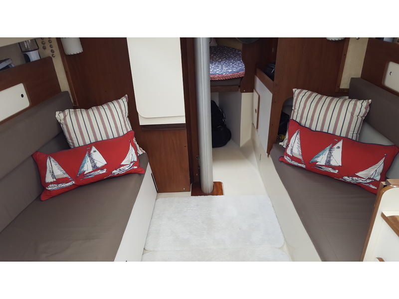 Velcro screens for main and forward hatches, cockpit cushions, updated foam cushions in main salon and V-berth, dropdown salon table w/leaf, LED lighting throughout, shore power duplex outlets (2).