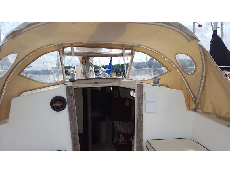Main with new sail cover (2014), Hood roller furling w/135% Genoa, storm jib, dodger, bimini, Lewmar 30 self tailing winches (2), locking winch handle. Flag blue Awlgrip hull (2010), tiller steering with tiller cover, teak dorade boxes w/SS cowl vents (2).