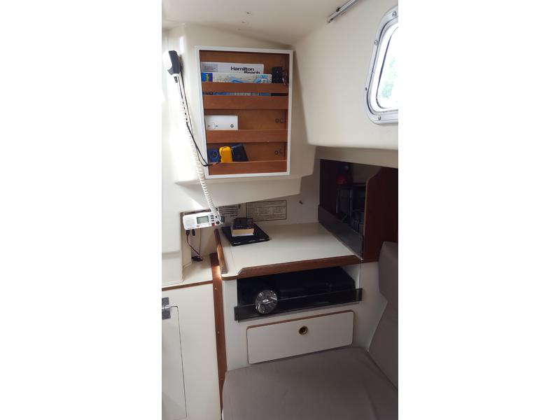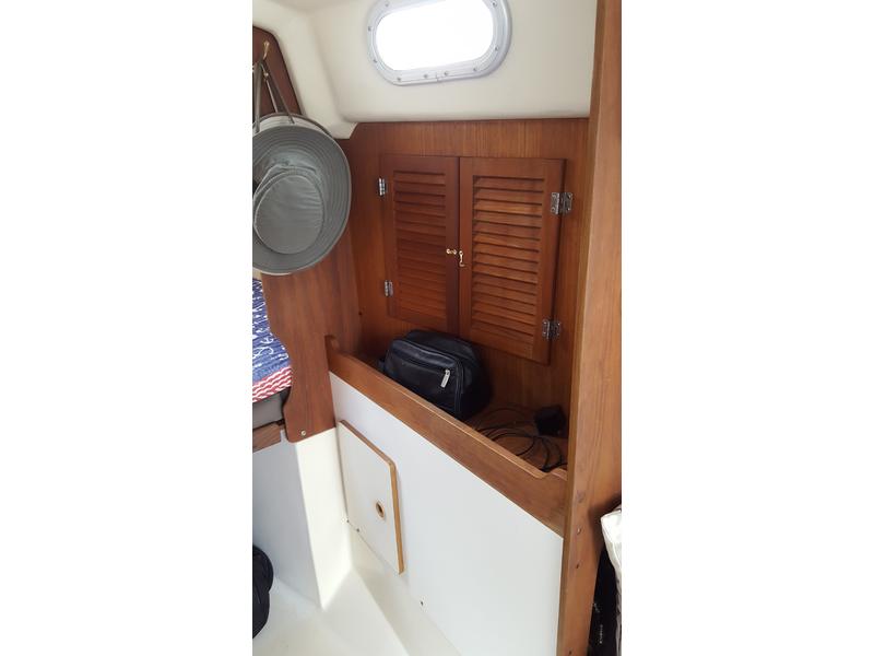 This is a stout/fast boat that is well known for its strong construction and ease of sail, with tiller steering for great feel of movement through the water. The cabin is roomy and very comfortable, whether day sailing or weekends away from shore. The V-berth comfortably sleeps 2 adults, while the salon settees add more sleeping accommodations. The galley boasts a stainless steel sink with pressurized water, a large icebox, and swing down prep counter. New marine head, plumbing, and holding tank were installed in 2014. Ample storage and teak accenting completes the experience. Additional pictures provided upon request.