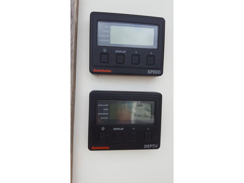 Windex, compass, digital knot meter, depth gauge, manual and auto bilge pump, spot light.