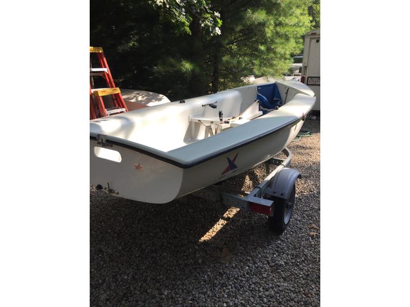2004 vanguard club flying junior sail boat, fast boat in excellent overall condition, always stored indoors, 98% freshwater use, has upgraded Harken rigging, spinnaker pole and sail, full cover, galvanized trailer all in excellent condition. FJs are comparable to 420s as they are virtually the same boat. |
