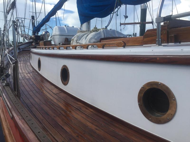 Fiberglass and Teak- completely refinished. Bottom is good.