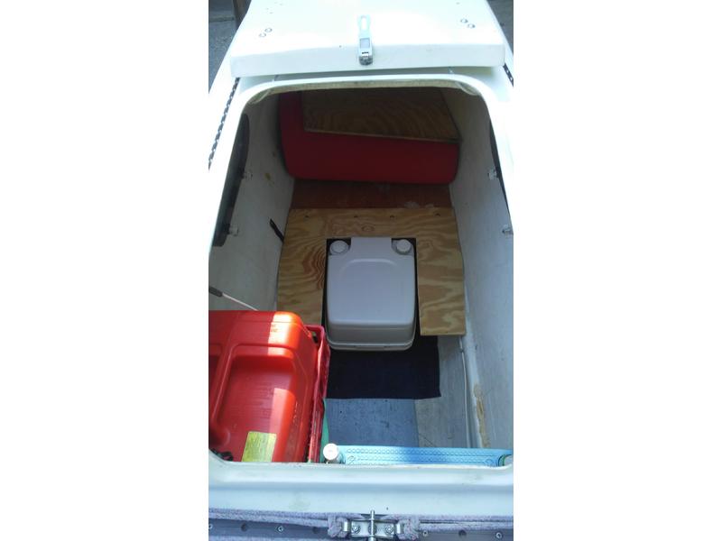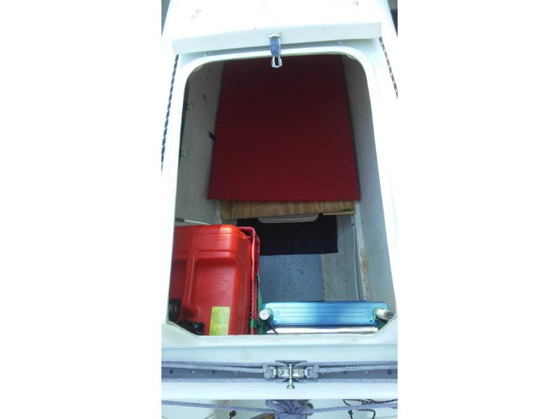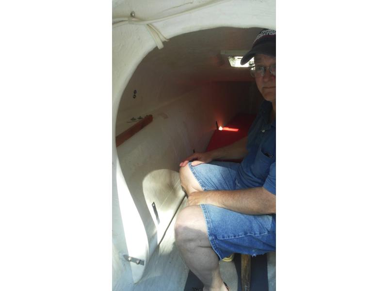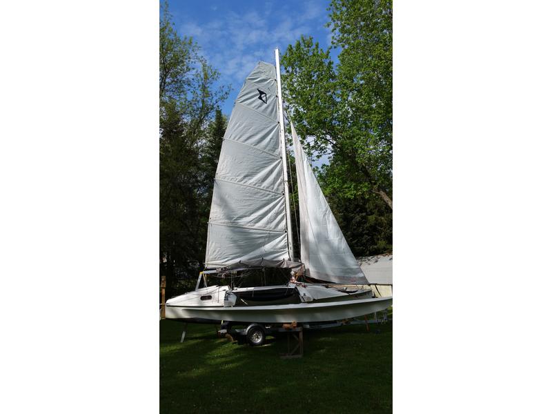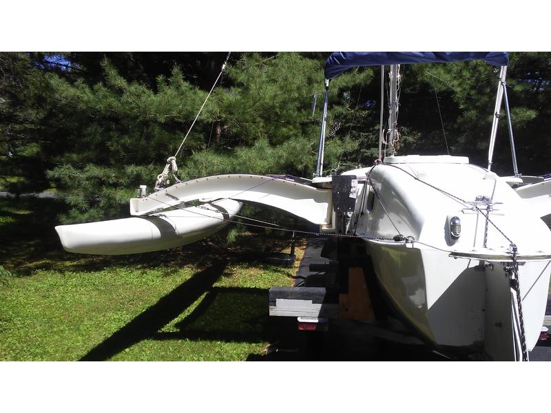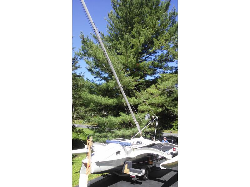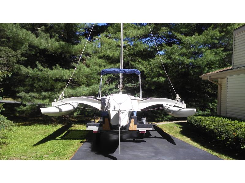 Trimaran can be folded in to a 8' beam on the water. Boat has 2 cabins, one fore and one aft to sleep one person in each cabin. Cabins have cushions & lights. Mast-raising system built into boat, can be launched by one person. This is a fast stable boat with a large cockpit & trampolines with lots of room to move around. This has a new Bimini.