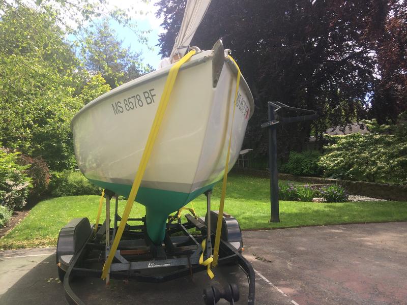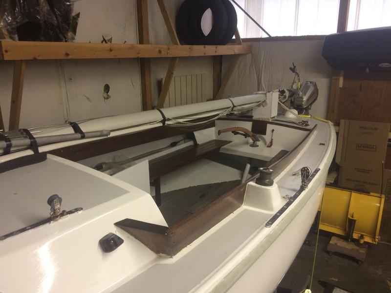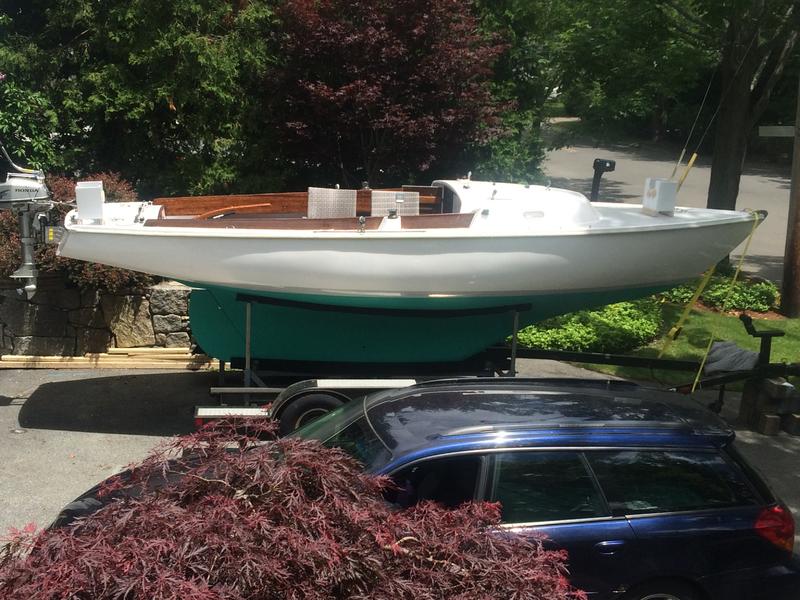 Pearson Ensign 1964 Hull #430 on twin axle trailer stored inside climite controlled warehouse. Honda 5 HP 4 stroke with controls mounted on boat tiller. Soda blasted in 2016 to bare fiberglass. Mahogany trim and seats disassembled and refinished. Hull and topsides redone. Hull Interlux two part white with Interlux two part silver bootstripe and nonskid. Bottom green. New winches. Roller furling head sail. Has not been launched since refurbishing. Call Alan (978) 590-4318