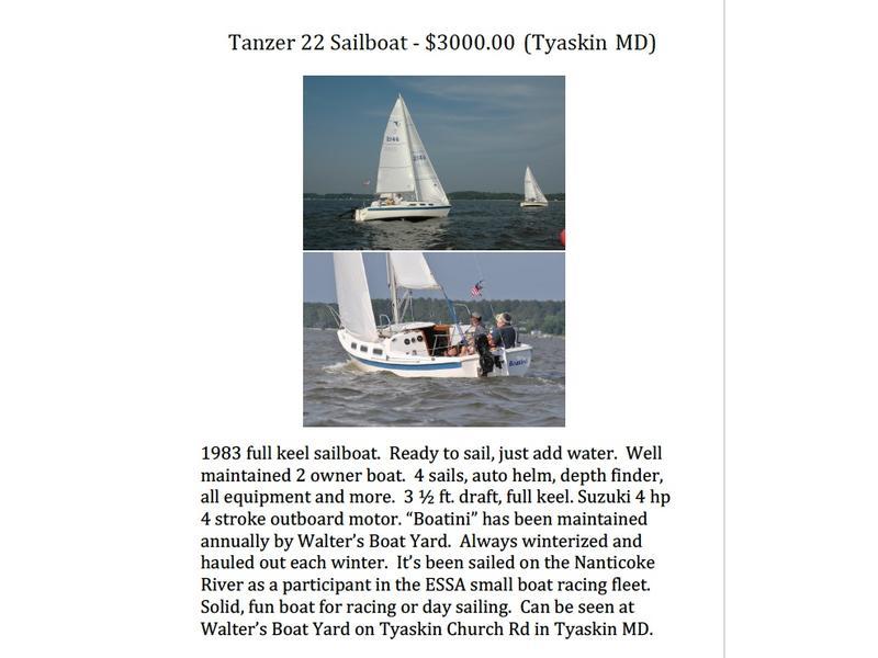 Clean, well maintained 2 owner Tanzer. A good family or first boat. Large cockpit Sailed and raced in the ESSA Bivalve Fleet on he Nanticoke River, off of the Chesapeake Bay. Local delivery possible. Hauled, stored and bottom painted each year.
