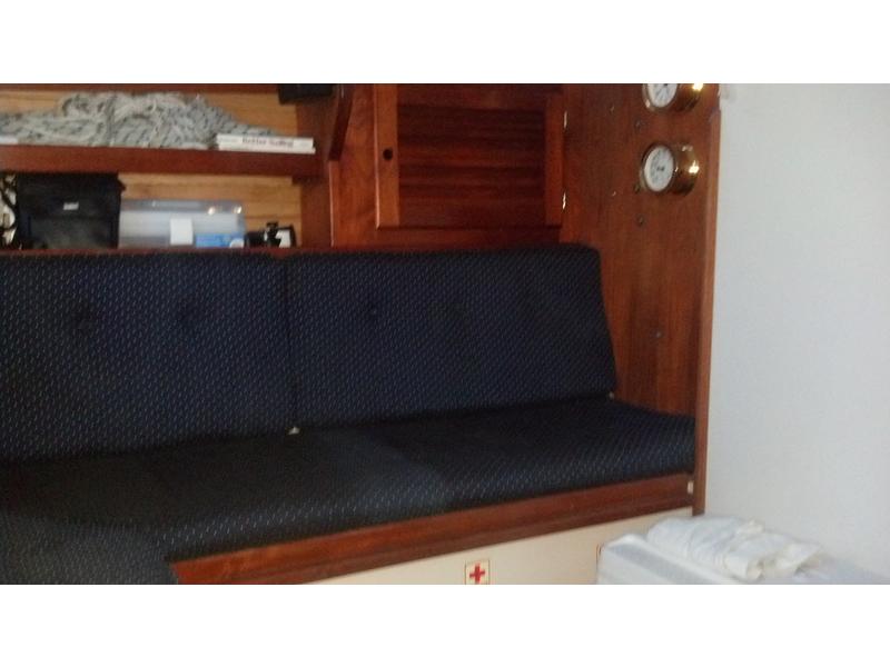 Sleeps seven. V berth forward, enclosed head with sink,shower, pressurized water Hanging locker and drawer storage opposite to starboard. Main cabin with settees port and starboard. Dining table stores on bulkhead when not in use. Port settee converts to form double berth. U-shaped galley aft to port. Sit-down navigation station opposite to starboard. Double berth under cockpit.